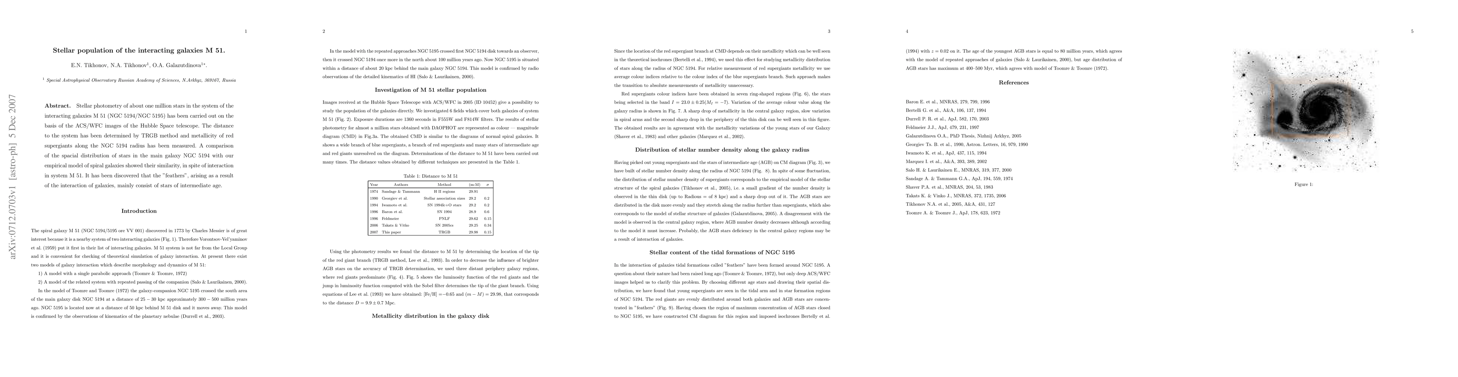 Stellar photometry of about one million stars in the system of the interacting galaxies M51 (NGC5194/NGC5195) has been carried out on the basis of the ACS/WFC images of the Hubble Space telescope. The distance to the system has been determined by TRGB method and metallicity of red supergiants along the NGC5194 radius has been measured. A comparison of the spacial distribution of stars in the main galaxy NGC5194 with our empirical model of spiral galaxies showed their similarity, in spite of interaction in system M51. It has been discovered that the "feathers", arising as a result of the interaction of galaxies, mainly consist of stars of intermediate age.