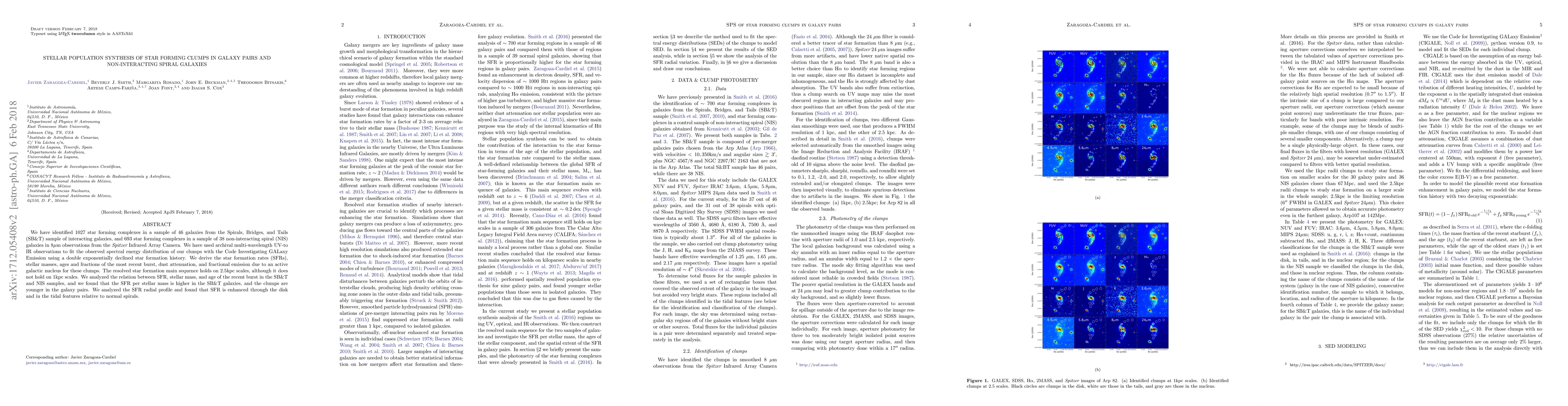 We have identified 1027 star forming complexes in a sample of 46 galaxies from the Spirals, Bridges, and Tails (SB&T) sample of interacting galaxies, and 693 star forming complexes in a sample of 38 non-interacting spiral (NIS) galaxies in $8\rm{\mu m}$ observations from the Spitzer Infrared Array Camera. We have used archival multi-wavelength UV-to IR observations to fit the observed spectral energy distribution (SED) of our clumps with the Code Investigating GALaxy Emission (CIGALE) using a double exponentially declined star formation history (SFH). We derive SFRs, stellar masses, ages and fractions of the most recent burst, dust attenuation, and fractional emission due to an AGN for these clumps. The resolved star formation main sequence holds on 2.5kpc scales, although it does not hold on 1kpc scales. We analyzed the relation between SFR, stellar mass, and age of the recent burst in the SB&T and NIS samples, and we found that the SFR per stellar mass is higher in the SB&T galaxies, and the clumps are younger in the galaxy pairs. We analyzed the SFR radial profile and found that SFR is enhanced through the disk and in the tidal features relative to normal spirals.