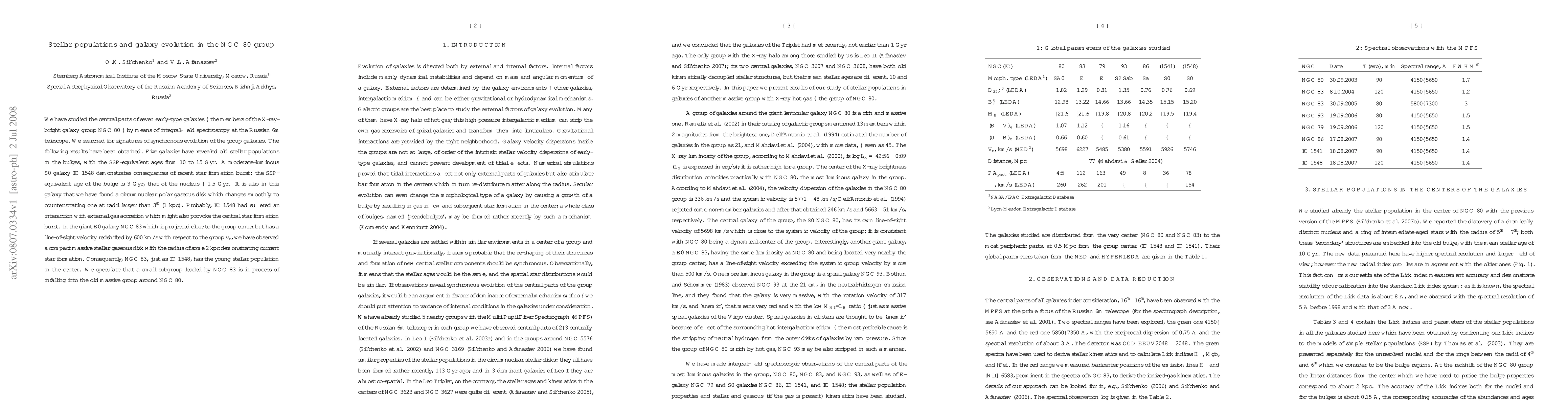 We have studied the central parts of seven early-type galaxies -- the members of the X-ray-bright galaxy group NGC 80 -- by means of integral-field spectroscopy at the Russian 6m telescope. We searched for signatures of synchronous evolution of the group galaxies. The following results have been obtained. Five galaxies have revealed old stellar populations in the bulges, with the SSP-equivalent ages from 10 to 15 Gyr. A moderate-luminous S0 galaxy IC 1548 demonstrates consequences of recent star formation burst: the SSP-equivalent age of the bulge is 3 Gyr, that of the nucleus -- 1.5 Gyr. It is also in this galaxy that we have found a circumnuclear polar gaseous disk which changes smoothly to counterrotating one at radii larger than 3 arcsec(1 kpc). Probably, IC 1548 had suffered an interaction with external gas accretion which might also provoke the central star formation burst. In the giant E0 galaxy NGC 83 which is projected close to the group center but has a line-of-sight velocity redshifted by 600 km/s with respect to the group systemic velocity, we have observed a compact massive stellar-gaseous disk with the radius of some 2 kpc demonstrating current star formation. Consequently, NGC 83, just as IC 1548, has the young stellar population in the center. We speculate that a small subgroup leaded by NGC 83 is in process of infalling into the old massive group around NGC 80.