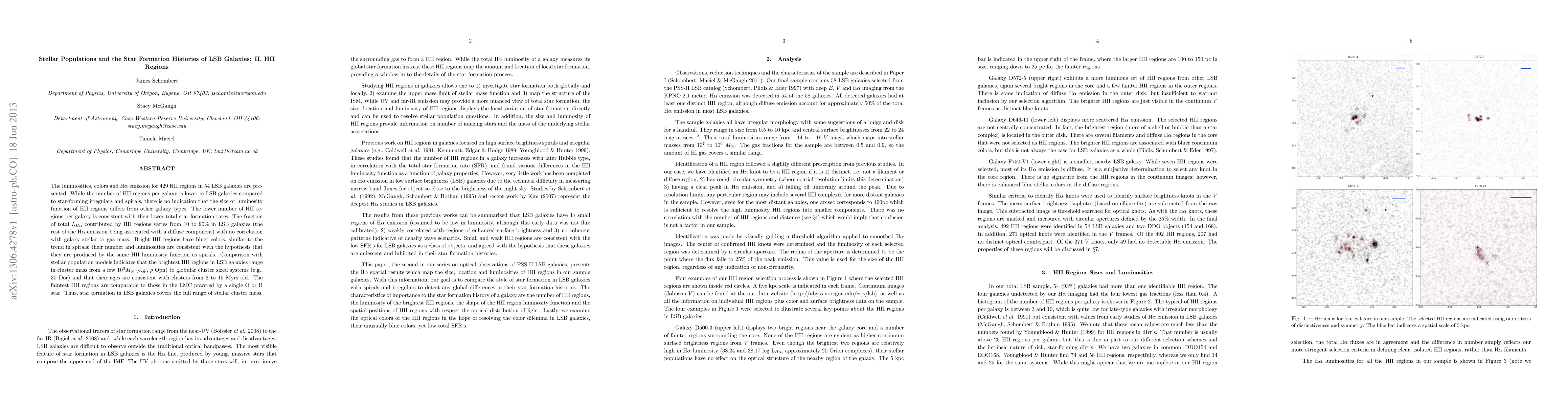 This paper examines 429 HII regions in 54 low surface brightness (LSB) galaxies, finding that while LSB galaxies have fewer HII regions than other star-forming galaxies, their size and luminosity function do not differ. The study concludes that star formation in LSB galaxies spans a wide range of stellar cluster masses, from small clusters to globular cluster-sized systems.
