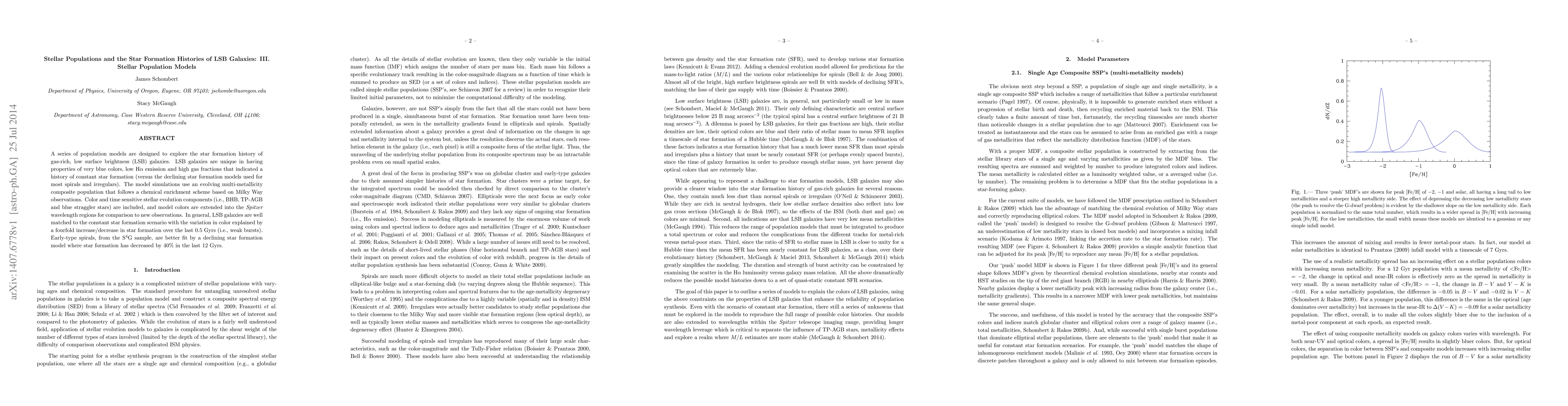 This paper develops stellar population models to investigate the star formation histories of low surface brightness (LSB) galaxies, finding that they align with a constant star formation model, while early-type spirals from the S$^4$G sample fit better with a declining star formation model.