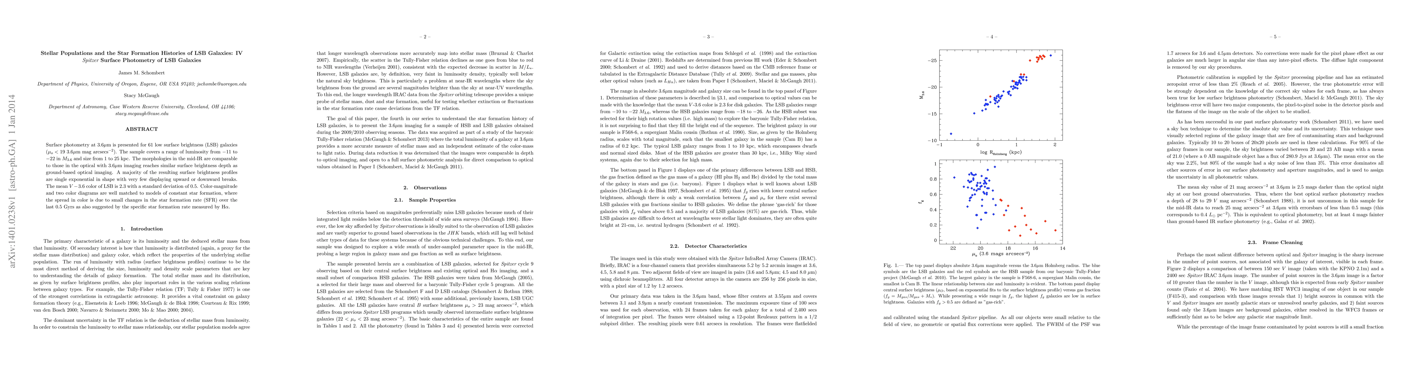 Surface photometry at 3.6$\mu$m is presented for 61 low surface brightness (LSB) galaxies ($\mu_o < 19$ 3.6$\mu$m mag arcsecs$^{-2}$). The sample covers a range of luminosity from $-$11 to $-$22 in $M_{3.6}$ and size from 1 to 25 kpc. The morphologies in the mid-IR are comparable to those in the optical with 3.6$\mu$m imaging reaches similar surface brightness depth as ground-based optical imaging. A majority of the resulting surface brightness profiles are single exponential in shape with very few displaying upward or downward breaks. The mean $V-3.6$ color of LSB is 2.3 with a standard deviation of 0.5. Color-magnitude and two color diagrams are well matched to models of constant star formation, where the spread in color is due to small changes in the star formation rate (SFR) over the last 0.5 Gyrs as also suggested by the specific star formation rate measured by H$\alpha$.