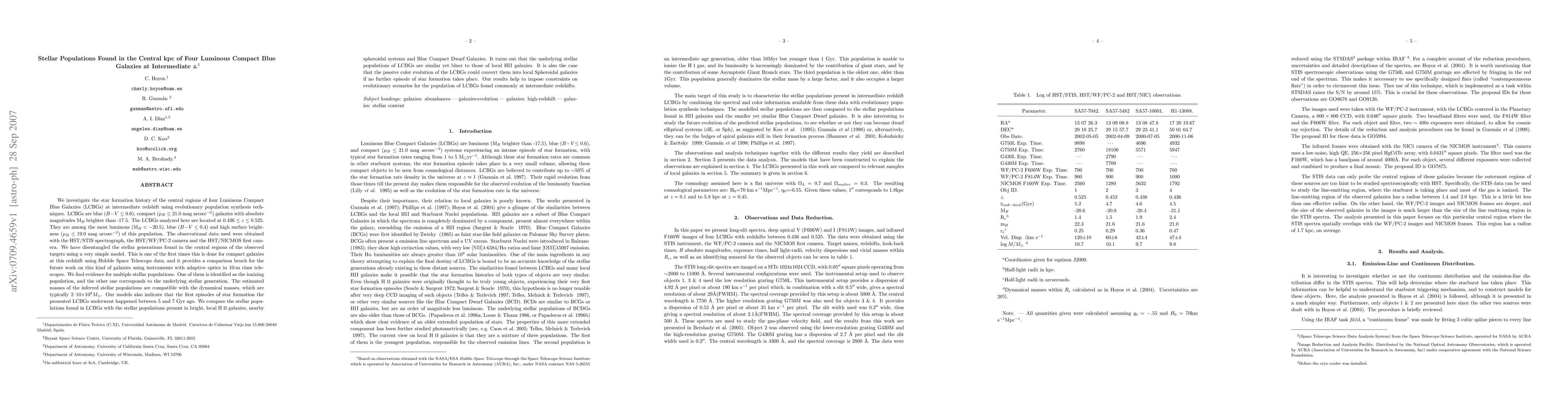 This study uses HST data to find evidence of multiple stellar populations in the central regions of four luminous compact blue galaxies (LCBGs) at intermediate redshifts. The populations, identified as an ionizing and an underlying generation, have masses (2--10x 10^9 M_sun) comparable to dynamical masses. The research suggests that star formation in these LCBGs peaked 5-7 Gyr ago and their underlying populations resemble bluer local HII galaxies. If star formation ceases, LCBGs could evolve into local spheroidal systems, informing evolutionary models of these intermediate redshift galaxies.