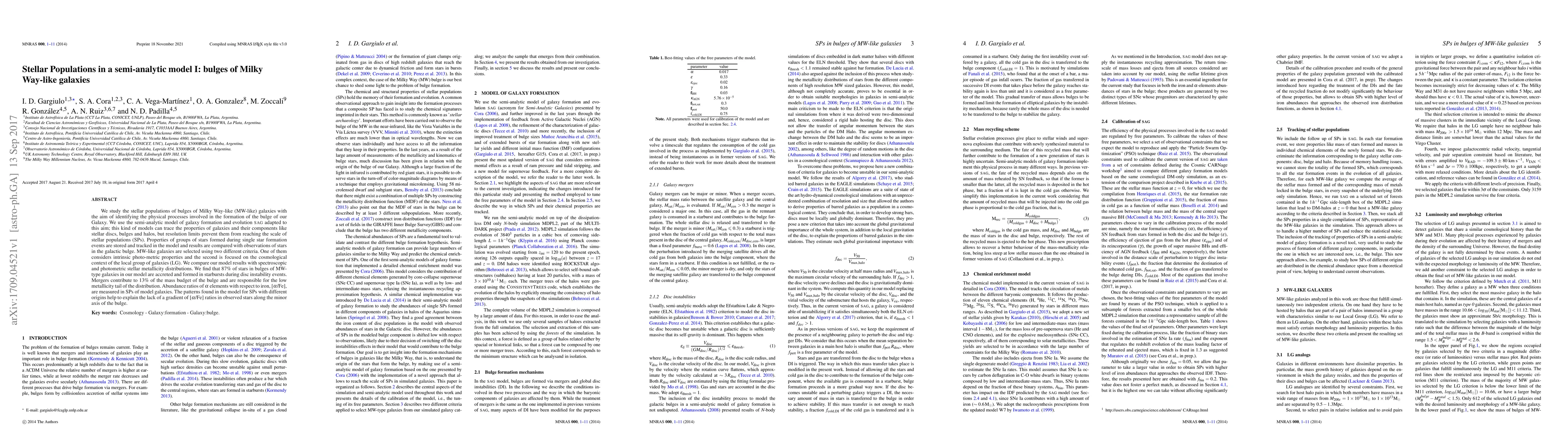 We study the stellar populations of bulges of Milky Way-like (MW-like) galaxies with the aim of identifying the physical processes involved in the formation of the bulge of our Galaxy. We use the semi-analytic model of galaxy formation and evolution SAG adapted to this aim; this kind of models can trace the properties of galaxies and their components like stellar discs, bulges and halos, but resolution limits prevent them from reaching the scale of stellar populations (SPs). Properties of groups of stars formed during single star formation events are stored and tracked in the model and results are compared with observations of stars in the galactic bulge. MW-like galaxies are selected using two different criteria. One of them considers intrinsic photo-metric properties and the second is focused on the cosmological context of the local group of galaxies (LG). We compare our model results with spectroscopic and photometric stellar metallicity distributions. We find that 87% of stars in bulges of MWtype galaxies in our model are accreted and formed in starbursts during disc instability events. Mergers contribute to 13% of the mass budget of the bulge and are responsible for the low metallicity tail of the distribution. Abundance ratios of {\alpha} elements with respect to iron, [{\alpha}/Fe], are measured in SPs of model galaxies. The patterns found in the model for SPs with different origins help to explain the lack of a gradient of [{\alpha}/Fe] ratios in observed stars along the minor axis of the bulge.