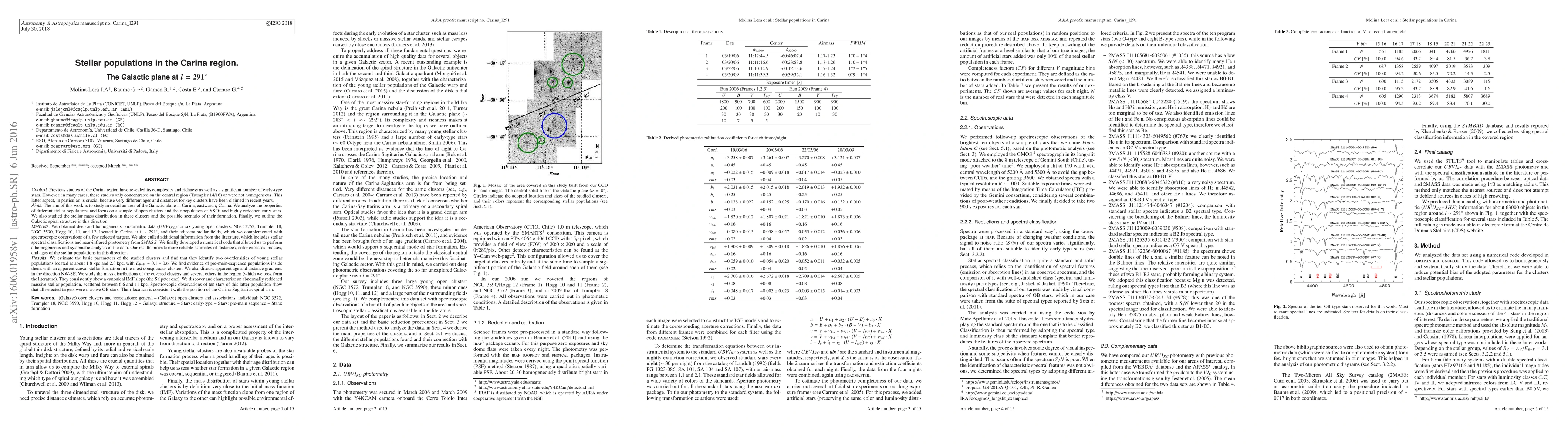 Previous studies of the Carina region have revealed its complexity and richness as well as a significant number of early-type stars. In many cases, these studies only concentrated on the central region or were not homogeneous. This latter aspect, in particular, is crucial because very different ages and distances for key clusters have been claimed in recent years. The aim of this work is to study in detail an area of the Galactic plane in Carina. We analyze the properties of different stellar populations and focus on a sample of open clusters and their population of YSOs and highly reddened early stars. We also studied the stellar mass distribution in these clusters and the possible scenario of their formation. Finally, we outline the Galactic spiral structure in this direction. We obtained photometric data for six young open clusters located in Carina at l = 291, and their adjacent stellar fields, which we complemented with spectroscopic observations of a few selected targets. We also culled additional information from the literature. Our results provide more reliable estimates of distances, color excesses, masses, and ages of the stellar populations in this direction. We estimate the basic parameters of the studied clusters and find that they identify two overdensities of young stellar populations. We find evidence of PMS populations inside them, with an apparent coeval stellar formation in the most conspicuous clusters. We also discuss apparent age and distance gradients in the direction NW-SE. We study the mass distributions of several clusters in the region. They consistently show a canonical IMF slope. We discover and characterise an abnormally reddened massive stellar population. Spectroscopic observations of ten stars of this latter population show that all selected targets were massive OB stars. Their location is consistent with the position of the Car-Sag spiral arm.