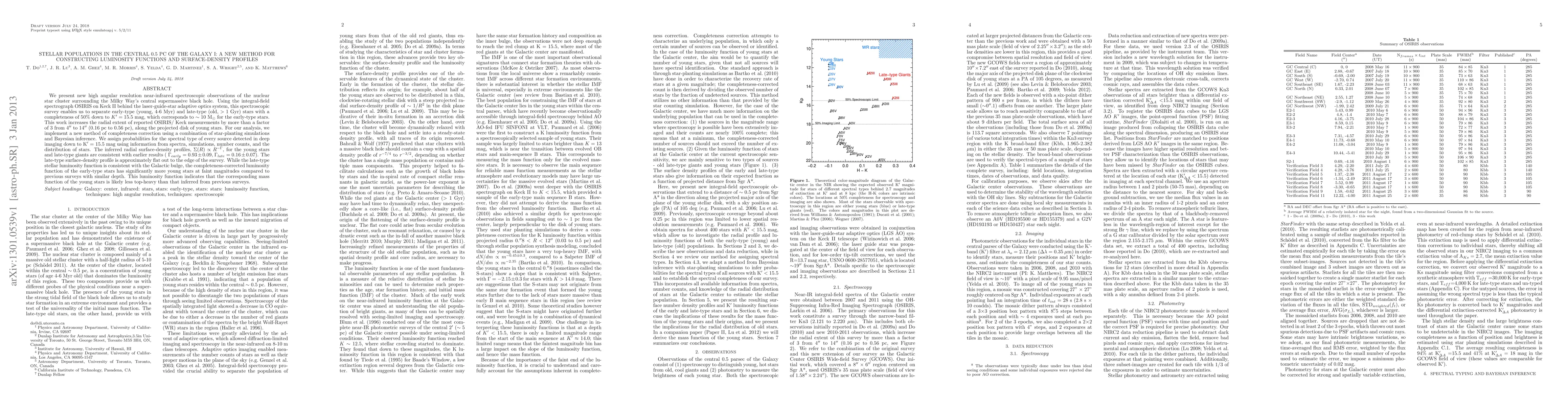 We present new high angular resolution near-infrared spectroscopic observations of the nuclear star cluster surrounding the Milky Way's central supermassive black hole. Using the integral-field spectrograph OSIRIS on Keck II behind the laser-guide-star adaptive optics system, this spectroscopic survey enables us to separate early-type (young, 4-6 Myr) and late-type (old, >1 Gyr) stars with a completeness of 50% down to K' = 15.5 mag, which corresponds to ~10 \msun for the early-type stars. This work increases the radial extent of reported OSIRIS/Keck measurements by more than a factor of 3 from 4" to 14" (0.16 pc to 0.56 pc), along the projected disk of young stars. For our analysis, we implement a new method of completeness correction using a combination of star-planting simulations and Bayesian inference. We assign probabilities for the spectral type of every source detected in deep imaging down to K' = 15.5 mag using information from spectra, simulations, number counts, and the distribution of stars. The inferred radial surface-density profiles, $\Sigma(R) \propto R^{-\Gamma}$, for the young stars and late-type giants are consistent with earlier results ($\Gamma_{early} = 0.93 \pm 0.09$, $\Gamma_{late} = 0.16 \pm 0.07$). The late-type surface-density profile is approximately flat out to the edge of the survey. While the late-type stellar luminosity function is consistent with the Galactic bulge, the completeness-corrected luminosity function of the early-type stars has significantly more young stars at faint magnitudes compared to previous surveys with similar depth. This luminosity function indicates that the corresponding mass function of the young stars is likely less top-heavy than that inferred from previous surveys.