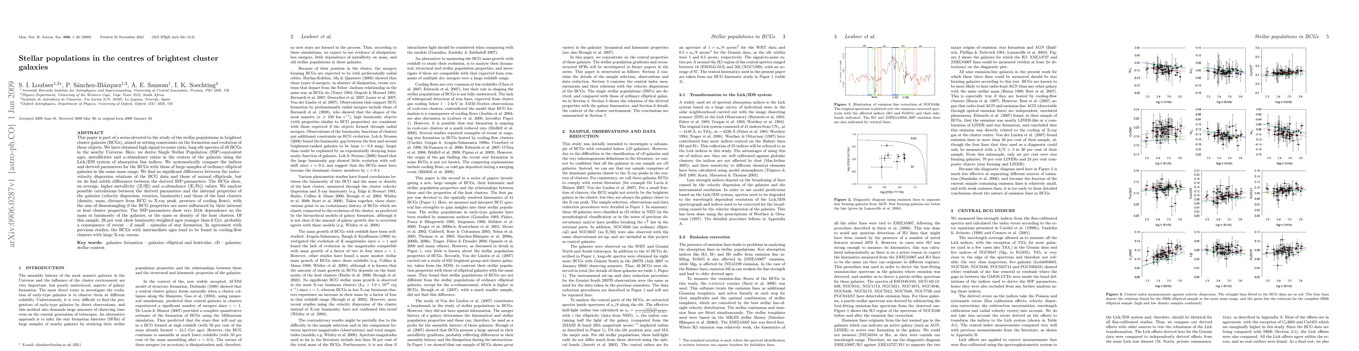 This study investigates stellar populations in the centres of brightest cluster galaxies (BCGs) using high-quality spectra, finding higher average metallicity and alpha-abundance compared to ordinary ellipticals. The research reveals minimal dependence of these parameters on galaxy or cluster mass, suggesting BCG properties are more influenced by internal processes rather than external cluster conditions.