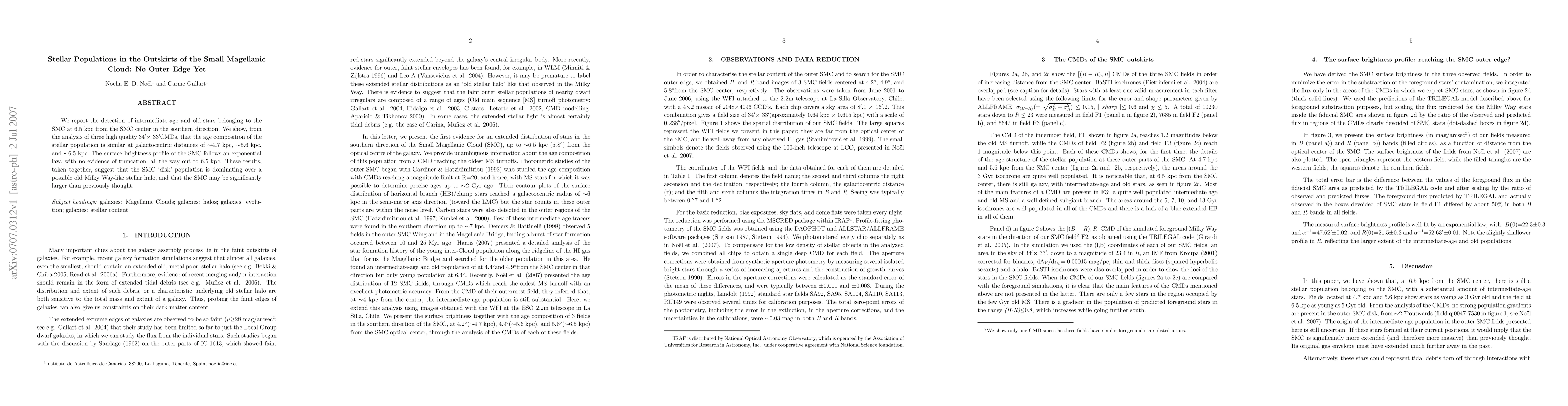 We report the detection of intermediate-age and old stars belonging to the SMC at 6.5 kpc from the SMC center in the southern direction. We show, from the analysis of three high quality 34\arcmin $\times$ 33\arcmin CMDs, that the age composition of the stellar population is similar at galactocentric distances of $\thicksim$4.7 kpc, $\thicksim$5.6 kpc, and $\thicksim$6.5 kpc. The surface brightness profile of the SMC follows an exponential law, with no evidence of truncation, all the way out to 6.5 kpc. These results, taken together, suggest that the SMC `disk' population is dominating over a possible old Milky Way-like stellar halo, and that the SMC may be significantly larger than previously thought.