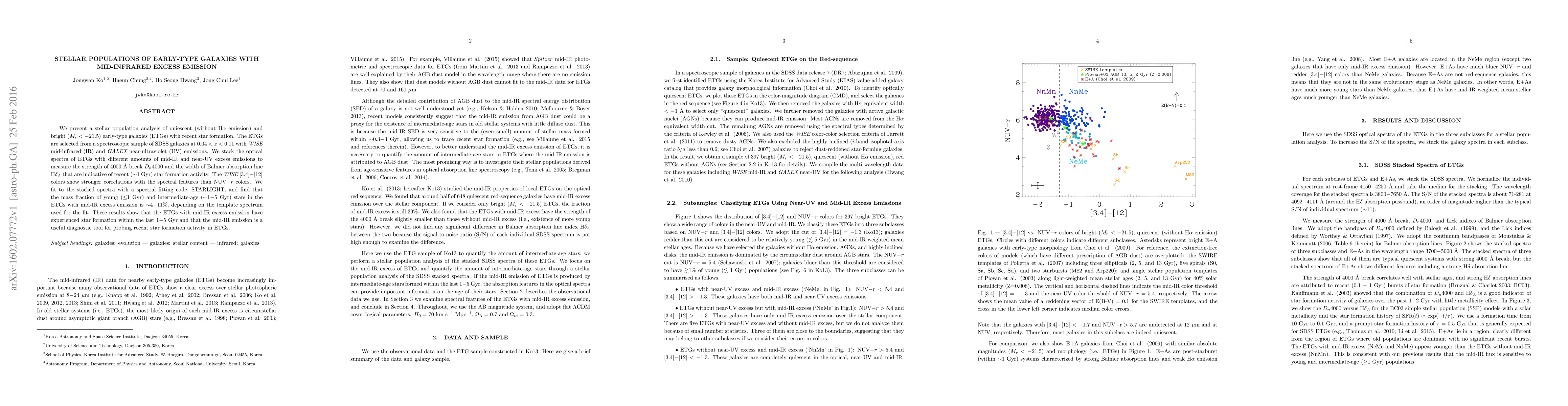 This paper analyzes the stellar populations in early-type galaxies (ETGs) exhibiting mid-infrared excess emissions, indicating recent star formation. Using stacked optical spectra and spectral fitting, it finds that these ETGs contain 4-11% of young and intermediate-age stars, suggesting recent star formation within the last 1-5 Gyr.