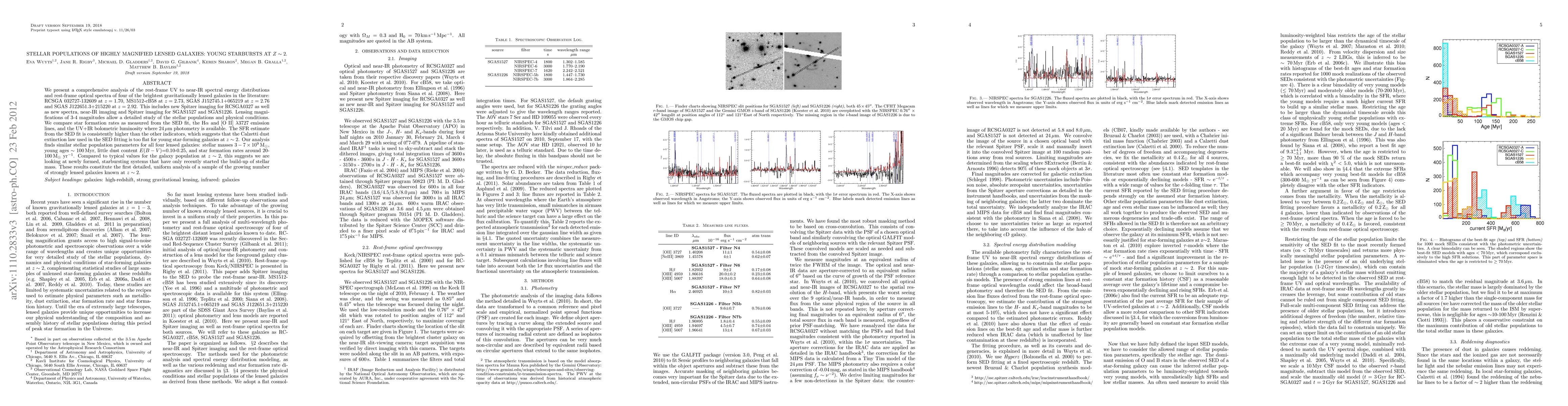 This paper analyzes the stellar populations and star formation rates of four highly magnified, lensed galaxies at z~2, revealing young starbursts with stellar masses of 3-7 x 10^9 M_sun and star formation rates of 20-100 M_sun/yr. The study finds that the Calzetti dust extinction law may be too flat for these galaxies, suggesting newly formed starburst systems.