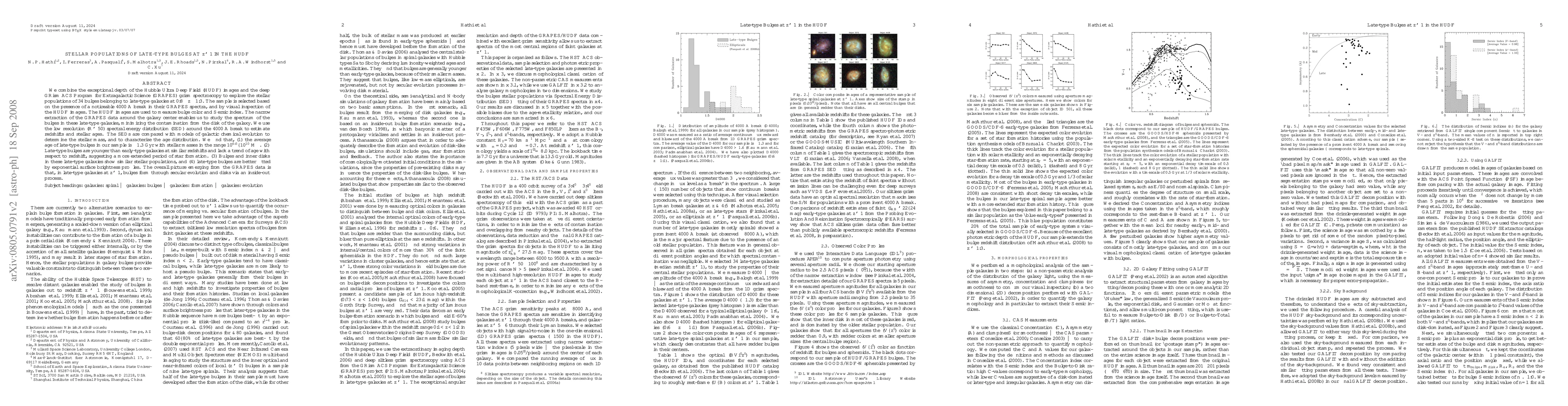 This study combines HUDF images and GRAPES grism spectroscopy to analyze the stellar populations of 34 late-type galaxy bulges at z=0.8-1.3. The findings indicate that these bulges have average ages of ~1.3 Gyr and masses ranging from log(M)=6.5-10 solar, suggesting extended star formation periods and a secular formation process.