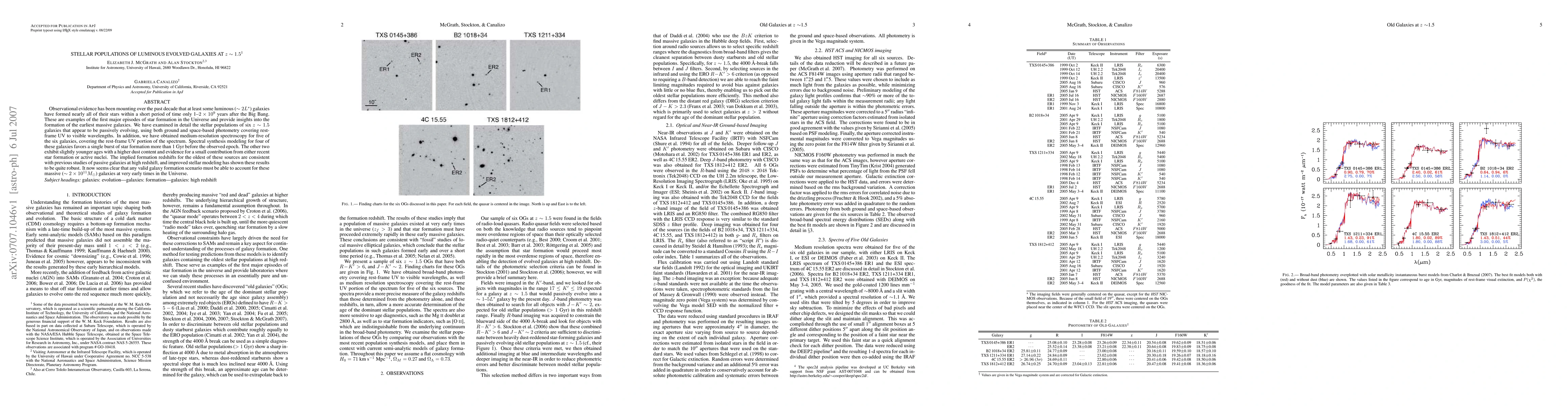 Observational evidence has been mounting over the past decade that at least some luminous (~2 L*) galaxies have formed nearly all of their stars within a short period of time only 1-2x10^9 years after the Big Bang. These are examples of the first major episodes of star formation in the Universe and provide insights into the formation of the earliest massive galaxies. We have examined in detail the stellar populations of six z~1.5 galaxies that appear to be passively evolving, using both ground and space-based photometry covering rest-frame UV to visible wavelengths. In addition, we have obtained medium-resolution spectroscopy for five of the six galaxies, covering the rest-frame UV portion of the spectrum. Spectral synthesis modeling for four of these galaxies favors a single burst of star formation more than 1 Gyr before the observed epoch. The other two exhibit slightly younger ages with a higher dust content and evidence for a small contribution from either recent star formation or active nuclei. The implied formation redshifts for the oldest of these sources are consistent with previous studies of passive galaxies at high redshift, and improved stellar modeling has shown these results to be quite robust. It now seems clear that any valid galaxy formation scenario must be able to account for these massive (2x10^11 M_sun) galaxies at very early times in the Universe.