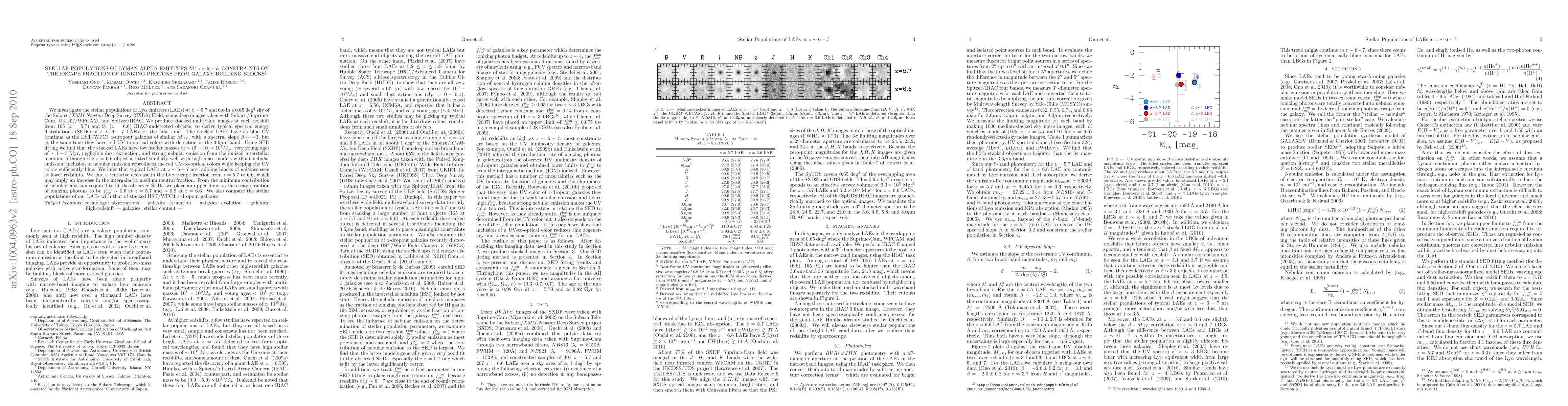 This paper examines the stellar populations of Lyman alpha emitters (LAEs) at redshifts z=5.7 and 6.6, revealing young, low-mass galaxies with negligible dust extinction. The study finds a tentative decrease in the Lyman alpha escape fraction over this redshift range, suggesting an increase in intergalactic medium neutral fraction, and sets an upper limit on the escape fraction of ionizing photons at these redshifts.
