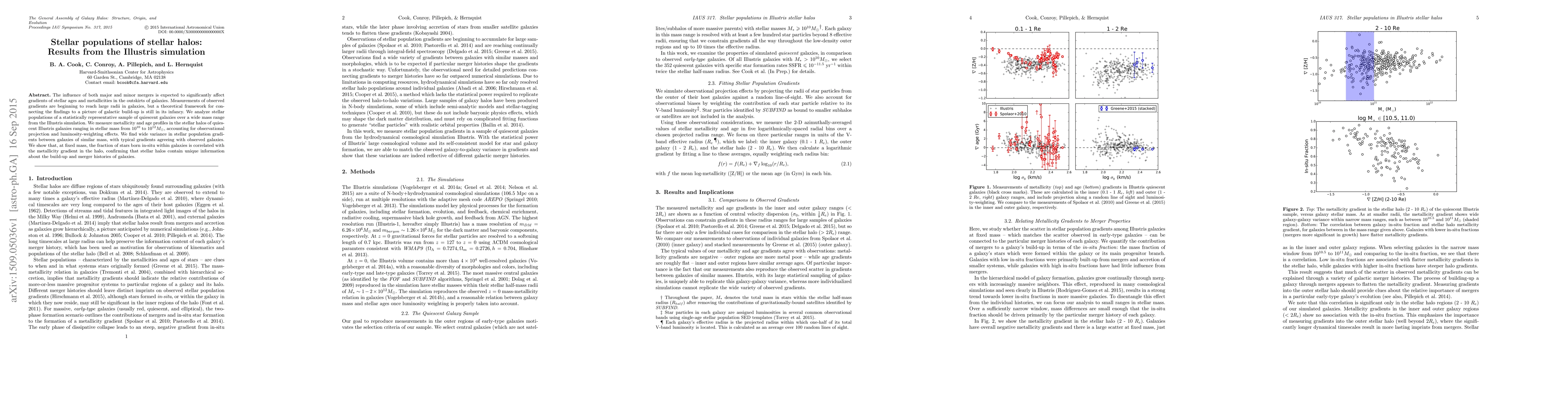 This paper analyzes stellar populations in the halos of quiescent galaxies from the Illustris simulation, finding significant variance in age and metallicity gradients. It concludes that the fraction of in-situ stars correlates with metallicity gradients, indicating that stellar halos reflect the galaxies' merger histories.
