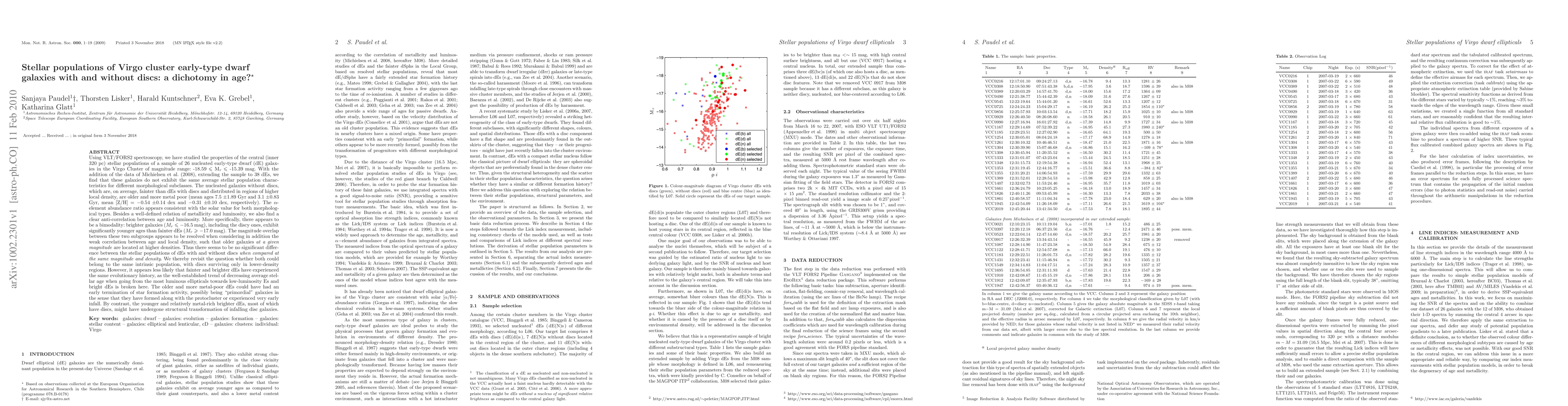 [Abridged] Using VLT/FORS2 spectroscopy, we have studied the properties of the central stellar populations of a sample of 38 nucleated early-type dwarf (dE) galaxies in the Virgo Cluster. We find that these galaxies do not exhibit the same average stellar population characteristics for different morphological subclasses. The nucleated galaxies without discs are older and more metal poor than the dEs with discs . The alpha-element abundance ratio appears consistent with the solar value for both morphological types. Besides a well-defined relation of metallicity and luminosity, we also find a clear anti-correlation between age and luminosity. More specifically, there appears to be a bimodality: brighter galaxies, including the discy ones, exhibit significantly younger ages than fainter dEs. Therefore, it appears less likely that fainter and brighter dEs have experienced the same evolutionary history, as the well-established trend of decreasing average stellar age when going from the most luminous ellipticals towards low-luminosity Es and bright dEs is broken here. The older and more metal-poor dEs could have had an early termination of star formation activity, possibly being "primordial" galaxies in the sense that they have formed along with the protocluster or experienced very early infall. By contrast, the younger and relatively metal-rich brighter dEs, most of which have discs, might have undergone structural transformation of infalling disc galaxies.