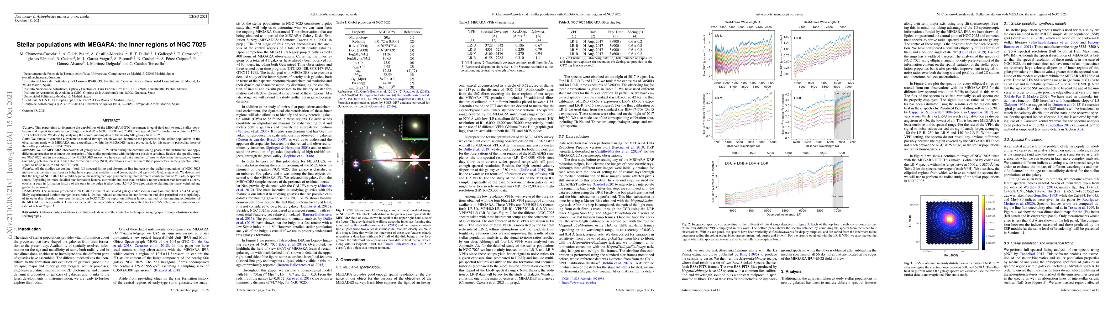 This paper investigates the stellar populations in the inner regions of NGC 7025 using the MEGARA@GTC instrument, revealing that the galaxy's bulge stars have supersolar metallicity and ages around 10 Gyr, with a minor merger event 3.5-4.5 Gyr ago influencing star formation and morphology. The study highlights the capabilities of MEGARA for detailed stellar population analysis.