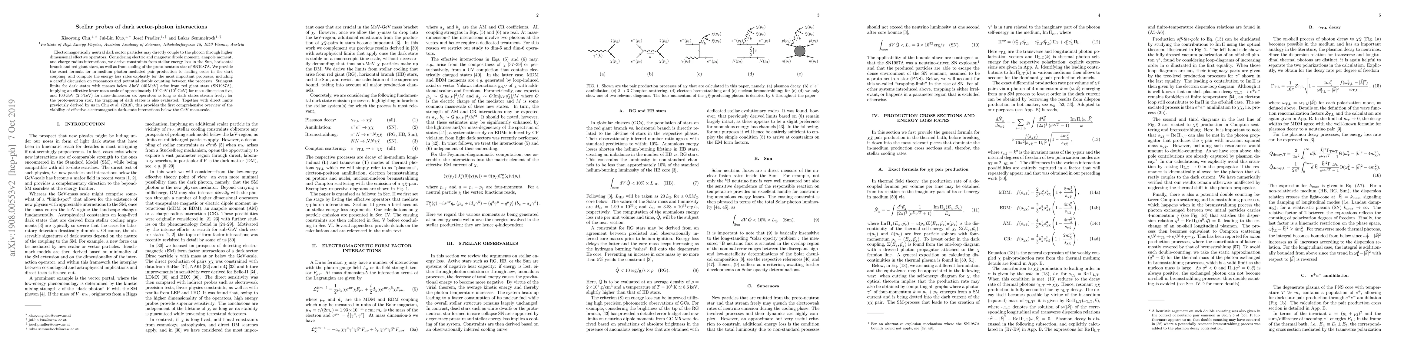 Electromagnetically neutral dark sector particles may directly couple to the photon through higher dimensional effective operators. Considering electric and magnetic dipole moment, anapole moment, and charge radius interactions, we derive constraints from stellar energy loss in the Sun, horizontal branch and red giant stars, as well as from cooling of the proto-neutron star of SN1987A. We provide the exact formula for in-medium photon-mediated pair production to leading order in the dark coupling, and compute the energy loss rates explicitly for the most important processes, including a careful discussion on resonances and potential double counting between the processes. Stringent limits for dark states with masses below $3\,$keV ($40\,$MeV) arise from red giant stars (SN1987A), implying an effective lower mass-scale of approximately $10^9\,$GeV ($10^7\,$GeV) for mass-dimension five, and $100\,$GeV ($2.5\,$TeV) for mass-dimension six operators as long as dark states stream freely; for the proto-neutron star, the trapping of dark states is also evaluated. Together with direct limits previously derived by us in Chu et al. (2018), this provides the first comprehensive overview of the viability of effective electromagnetic dark-state interactions below the GeV mass-scale.