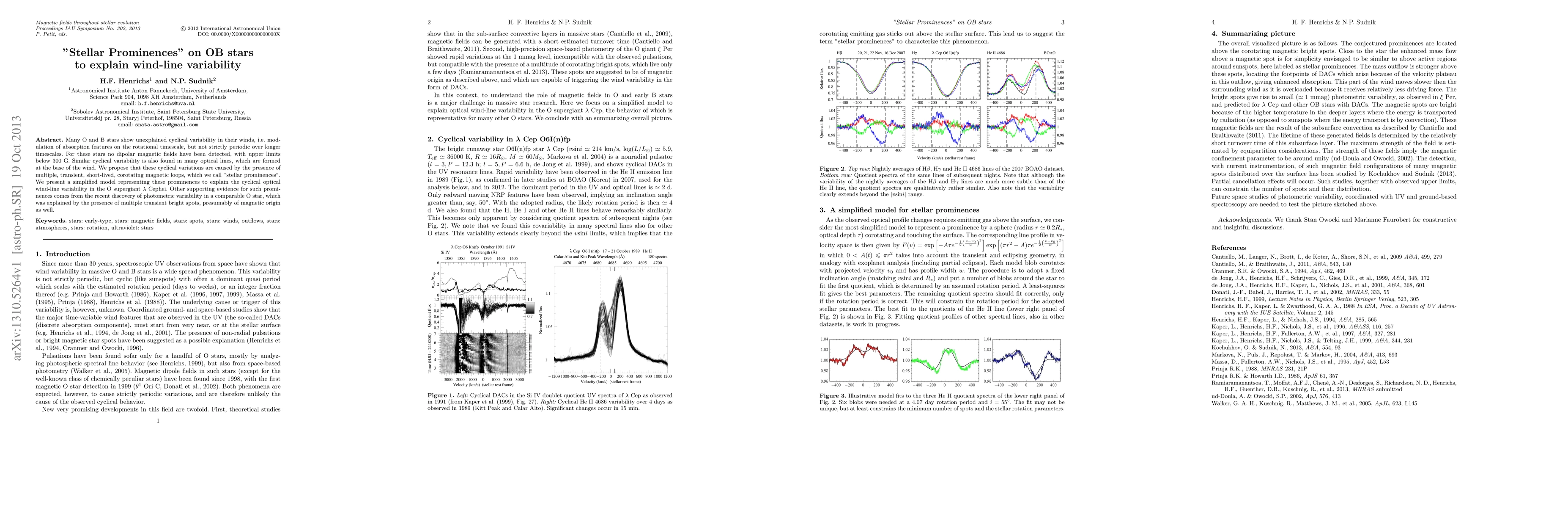 Many O and B stars show unexplained cyclical variability in their winds, i.e. modulation of absorption features on the rotational timescale, but not strictly periodic over longer timescales. For these stars no dipolar magnetic fields have been detected, with upper limits below 300 G. Similar cyclical variability is also found in many optical lines, which are formed at the base of the wind. We propose that these cyclical variations are caused by the presence of multiple, transient, short-lived, corotating magnetic loops, which we call "stellar prominences". We present a simplified model representing these prominences to explain the cyclical optical wind-line variability in the O supergiant lambda Cephei. Other supporting evidence for such prominences comes from the recent discovery of photometric variability in a comparable O star, which was explained by the presence of multiple transient bright spots, presumably of magnetic origin as well.