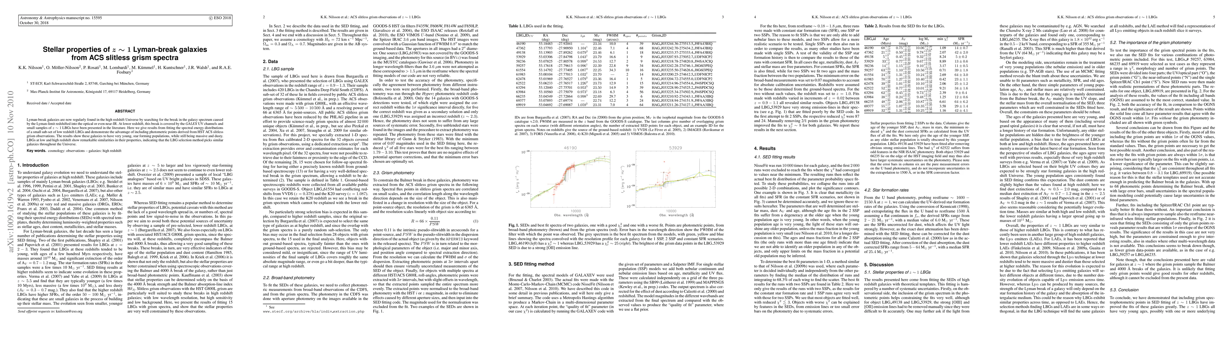 Lyman-break galaxies are now regularly found in the high redshift Universe by searching for the break in the galaxy spectrum caused by the Lyman-limit redshifted into the optical or even near-IR. At lower redshift, this break is covered by the GALEX UV channels and small samples of z ~ 1 LBGs have been presented in the literature. Here we give results from fitting the spectral energy distributions of a small sub-set of low redshift LBGs and demonstrate the advantage of including photometric points derived from HST ACS slitless grism observations. The results show these galaxies to have very young, star forming populations, while still being massive and dusty. LBGs at low and high redshift show remarkable similarities in their properties, indicating that the LBG selection method picks similar galaxies throughout the Universe.