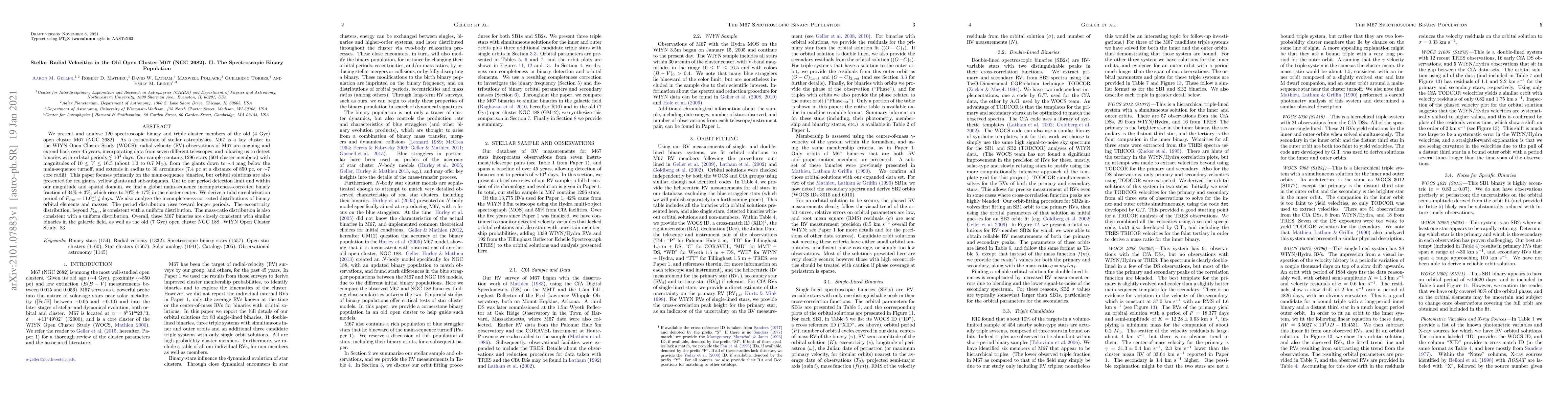 This paper analyzes 120 spectroscopic binary and triple stars in the old open cluster M67, revealing a main-sequence binary fraction of 34% that rises to 70% in the cluster center. The study finds tidal circularization at a period of 11 days and consistent orbital element distributions with binaries in the galactic field.