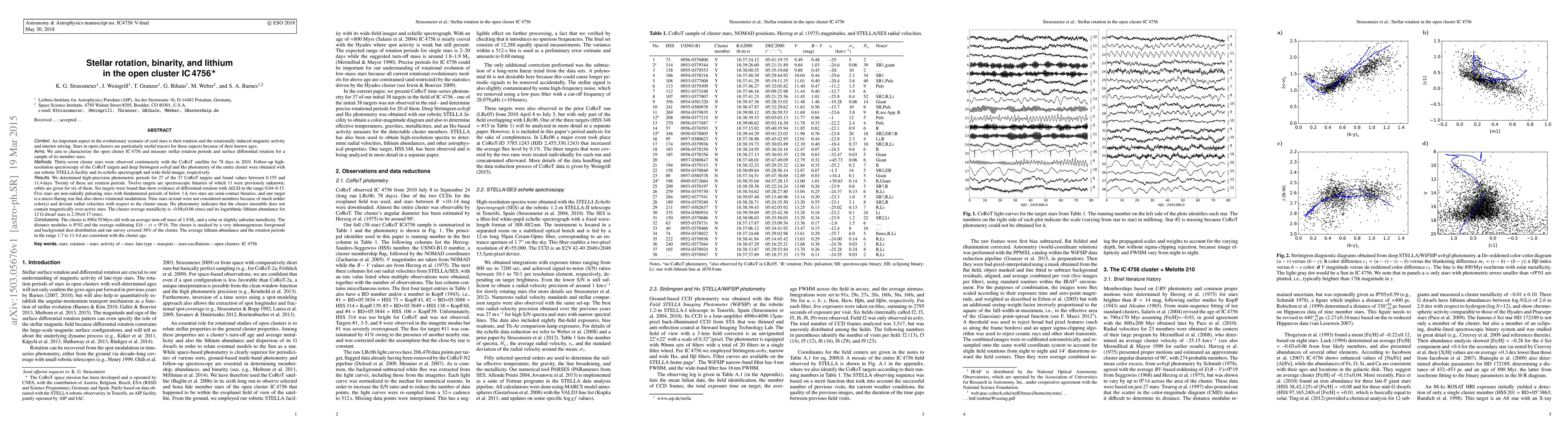 An important aspect in the evolutionary scenario of cool stars is their rotation and the rotationally induced magnetic activity and interior mixing. Stars in open clusters are particularly useful tracers for these aspects because of their known ages. We aim to characterize the open cluster IC4756 and measure stellar rotation periods and surface differential rotation for a sample of its member stars. Thirty-seven cluster stars were observed continuously with the CoRoT satellite for 78 days in 2010. Follow-up high-resolution spectroscopy of the CoRoT targets and deep Str\"omgren $uvby\beta$ and H$\alpha$ photometry of the entire cluster were obtained with our robotic STELLA facility and its echelle spectrograph and wide-field imager, respectively. We determined high-precision photometric periods for 27 of the 37 CoRoT targets and found values between 0.155 and 11.4 days. Twenty of these are rotation periods. Twelve targets are spectroscopic binaries of which 11 were previously unknown; orbits are given for six of them. Six targets were found that show evidence of differential rotation with $\Delta\Omega/\Omega$ in the range 0.04-0.15. Five stars are non-radially pulsating stars with fundamental periods of below 1d, two stars are semi-contact binaries, and one target is a micro-flaring star that also shows rotational modulation. Nine stars in total were not considered members because of much redder color(s) and deviant radial velocities with respect to the cluster mean. H$\alpha$ photometry indicates that the cluster ensemble does not contain magnetically over-active stars. The cluster average metallicity is -0.08$\pm$0.06 (rms) and its logarithmic lithium abundance for 12 G-dwarf stars is 2.39$\pm$0.17 (rms). [...]