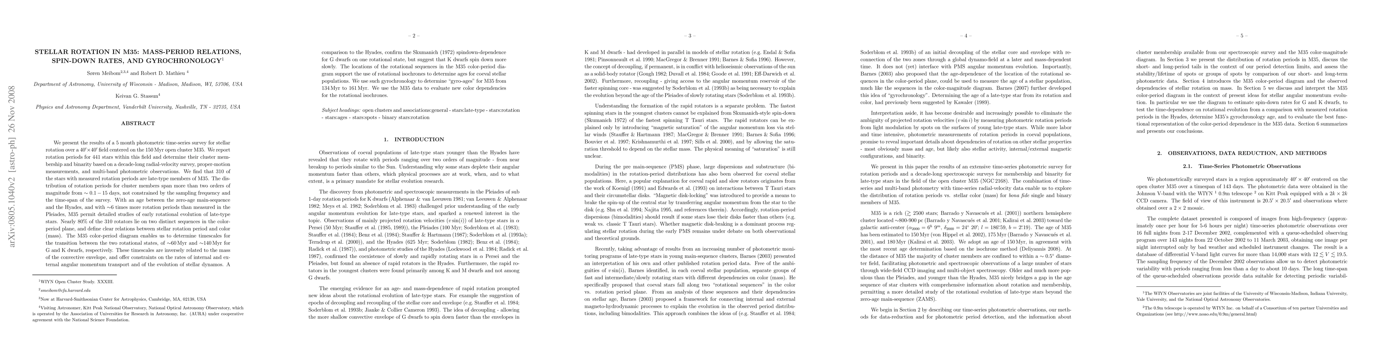 We present the results of a 5 month photometric time-series survey for stellar rotation over a 40'x40' field on the 150 Myr open cluster M35. We report rotation periods for 441 stars and determine their cluster membership and binarity based on a decade-long radial-velocity survey, proper-motion measurements, and multi-band photometric observations. We find that 310 of the stars with measured rotation periods are late-type members of M35. Their distribution of rotation periods span more than two orders of magnitude from ~0.1-15 days, not constrained by the sampling frequency and the time-span of the survey. With an age between the zero-age main-sequence and the Hyades, and with ~6 times more rotation periods than measured in the Pleiades, M35 permit detailed studies of early rotational evolution of late-type stars. Nearly 80% of the 310 rotators lie on two distinct sequences in the color-period plane, defining clear relations between stellar rotation period and color (mass). The M35 color-period diagram enables us to determine timescales for the transition between the two rotational states for G and K dwarfs, respectively. These timescales are inversely related to the mass of the convective envelope, and offer constraints on the rates of internal and external angular momentum transport and of the evolution of stellar dynamos. A comparison to the Hyades, confirm the Skumanich (1972) spindown-dependence for G dwarfs on one rotational state, but suggest that K dwarfs spin down more slowly. The locations of the rotational sequences in the M35 color-period diagram support the use of rotational isochrones to determine ages for coeval stellar populations. We use such gyrochronology to determine "gyro-ages" for M35. We use the M35 data to evaluate new color dependencies for the rotational isochrones.