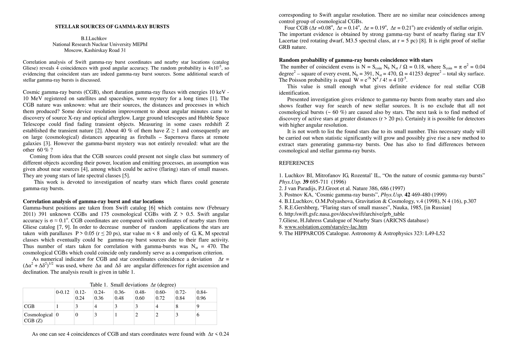 This study correlates Swift gamma-ray burst coordinates with nearby stars from the Gliese catalog, finding 4 significant coincidences with low random probability. This suggests that some of these stars may be sources of gamma-ray bursts, prompting further investigation into stellar gamma-ray bursts.