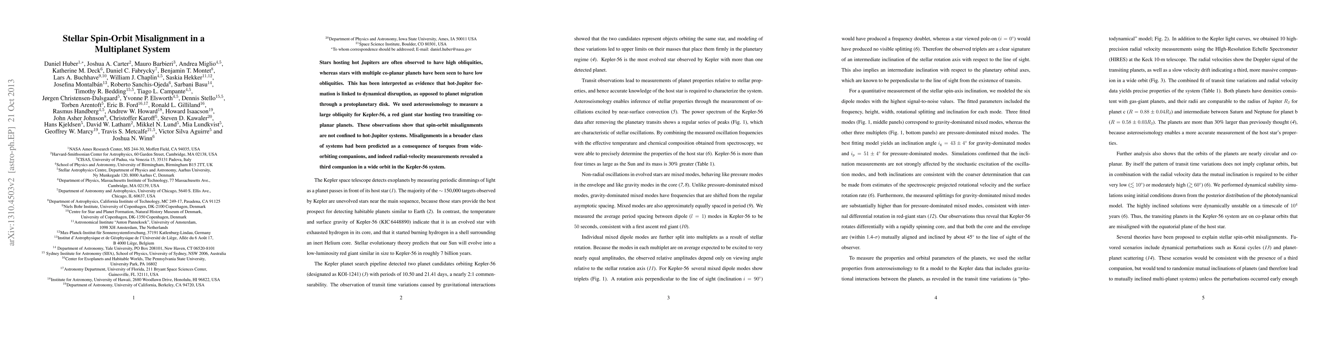 Stars hosting hot Jupiters are often observed to have high obliquities, whereas stars with multiple co-planar planets have been seen to have low obliquities. This has been interpreted as evidence that hot-Jupiter formation is linked to dynamical disruption, as opposed to planet migration through a protoplanetary disk. We used asteroseismology to measure a large obliquity for Kepler-56, a red giant star hosting two transiting co-planar planets. These observations show that spin-orbit misalignments are not confined to hot-Jupiter systems. Misalignments in a broader class of systems had been predicted as a consequence of torques from wide-orbiting companions, and indeed radial-velocity measurements revealed a third companion in a wide orbit in the Kepler-56 system.