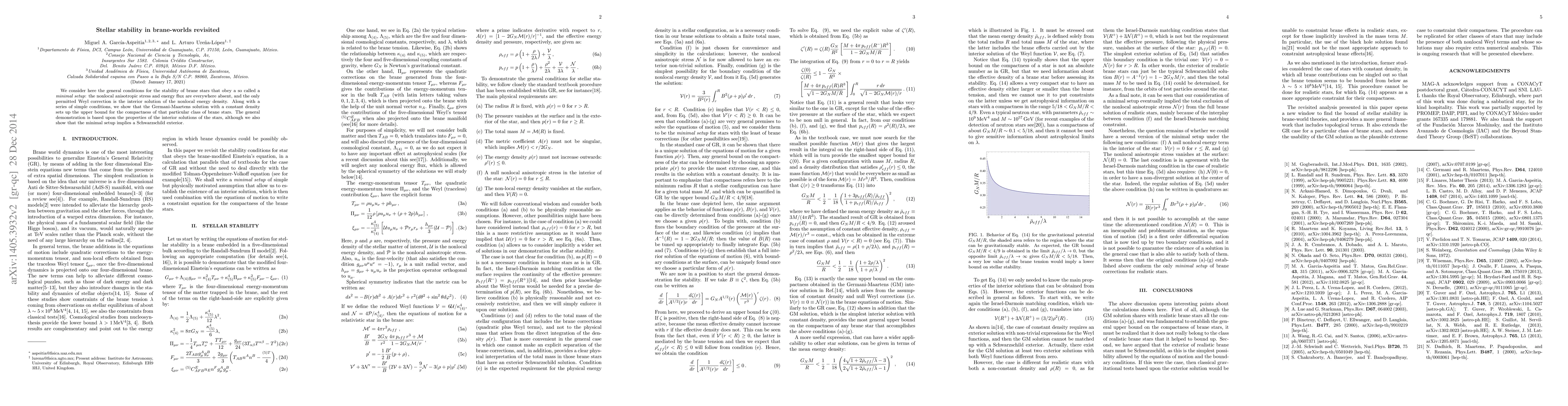 We consider here the general conditions for the stability of brane stars that obey a so called a "minimal setup": the nonlocal anisotropic stress and energy flux are everywhere absent, and the only permitted Weyl correction is the interior solution of the nonlocal energy density. Along with a series of simple conditions, we show that the Germani-Maartens solution with a constant density sets up the upper bound for the compactness of that particular class of brane stars. The general demonstration is based upon the properties of the interior solutions of the stars, although we also show that the minimal setup implies a Schwarzschild exterior.