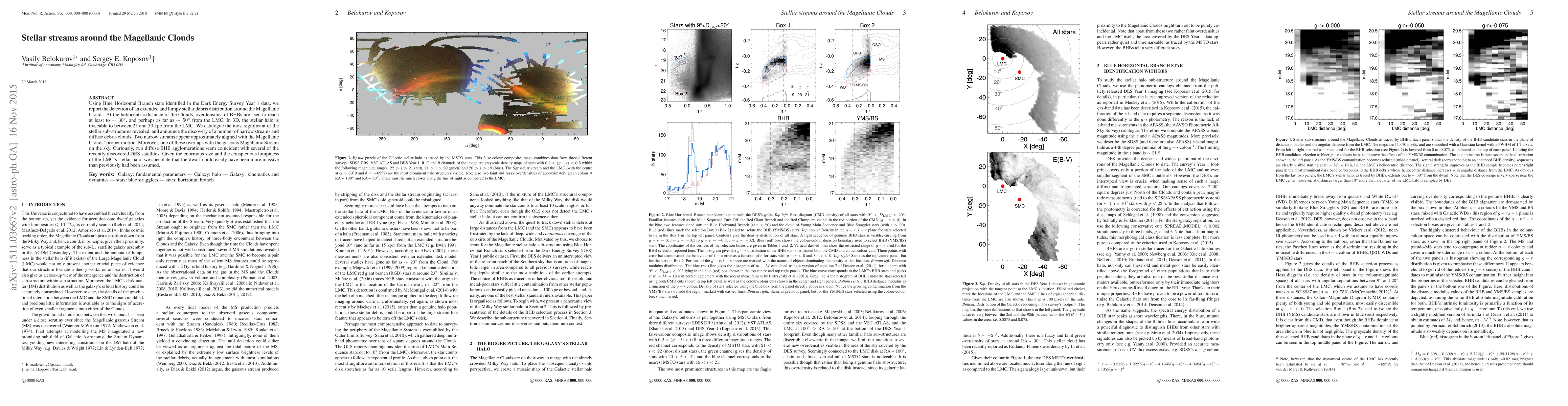 This paper reports the detection of extended and lumpy stellar streams around the Magellanic Clouds using Blue Horizontal Branch stars from the Dark Energy Survey. Significant stellar sub-structures, including narrow streams and diffuse debris clouds, are catalogued, suggesting the Large Magellanic Cloud may have been more massive than previously thought.