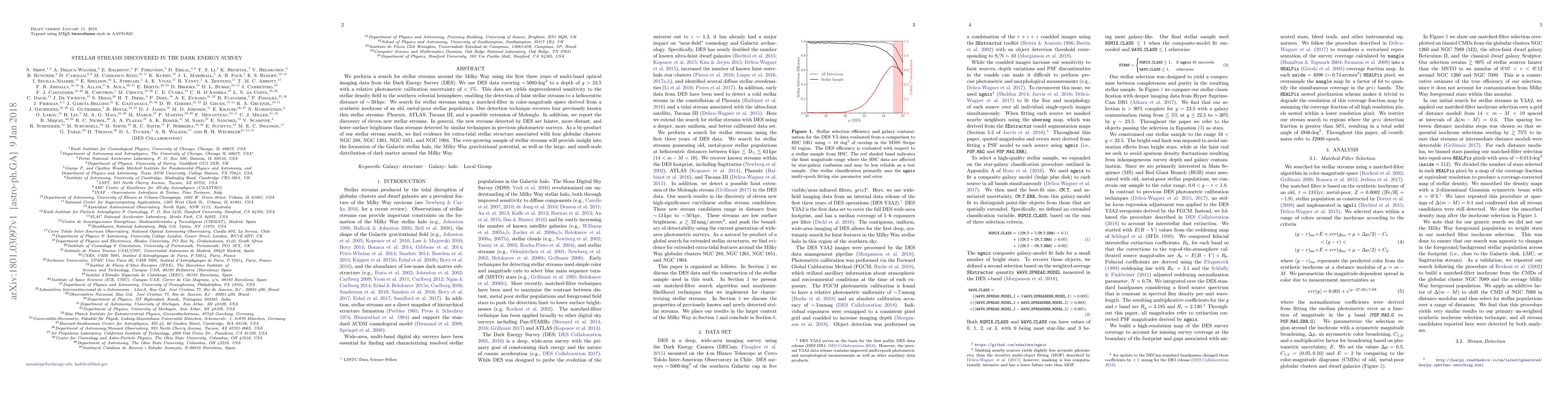 We perform a search for stellar streams around the Milky Way using the first three years of multi-band optical imaging data from the Dark Energy Survey (DES). We use DES data covering $\sim 5000$ sq. deg. to a depth of $g > 23.5$ with a relative photometric calibration uncertainty of $< 1 \%$. This data set yields unprecedented sensitivity to the stellar density field in the southern celestial hemisphere, enabling the detection of faint stellar streams to a heliocentric distance of $\sim 50$ kpc. We search for stellar streams using a matched-filter in color-magnitude space derived from a synthetic isochrone of an old, metal-poor stellar population. Our detection technique recovers four previously known thin stellar streams: Phoenix, ATLAS, Tucana III, and a possible extension of Molonglo. In addition, we report the discovery of eleven new stellar streams. In general, the new streams detected by DES are fainter, more distant, and lower surface brightness than streams detected by similar techniques in previous photometric surveys. As a by-product of our stellar stream search, we find evidence for extra-tidal stellar structure associated with four globular clusters: NGC 288, NGC 1261, NGC 1851, and NGC 1904. The ever-growing sample of stellar streams will provide insight into the formation of the Galactic stellar halo, the Milky Way gravitational potential, as well as the large- and small-scale distribution of dark matter around the Milky Way.