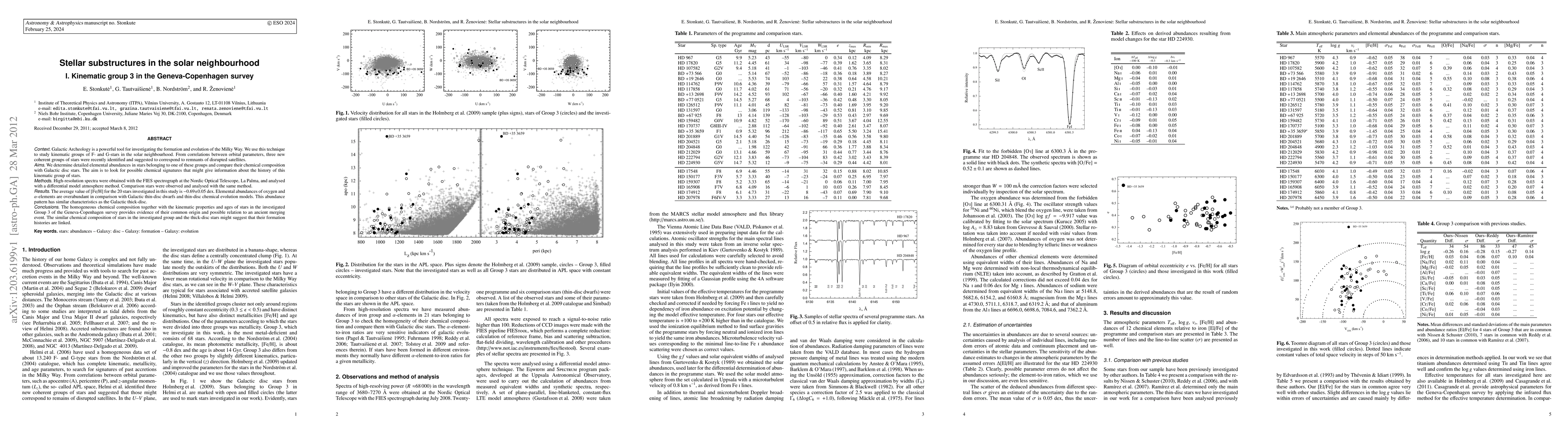 Galactic Archeology is a powerful tool for investigating the formation and evolution of the Milky Way. We use this technique to study kinematic groups of F- and G-stars in the solar neighbourhood. From correlations between orbital parameters, three new coherent groups of stars were recently identified and suggested to correspond to remnants of disrupted satellites. We determine detailed elemental abundances in stars belonging to one of these groups and compare their chemical composition with Galactic disc stars. The aim is to look for possible chemical signatures that might give information about the history of this kinematic group of stars. High-resolution spectra were obtained with the FIES spectrograph at the Nordic Optical Telescope, La Palma, and analysed with a differential model atmosphere method. Comparison stars were observed and analysed with the same method. The average value of [Fe/H] for the 20 stars investigated in this study is -0.69 +- 0.05 dex. Elemental abundances of oxygen and alpha-elements are overabundant in comparison with Galactic thin-disc dwarfs and thin-disc chemical evolution models. This abundance pattern has similar characteristics as the Galactic thick-disc. The homogeneous chemical composition together with the kinematic properties and ages of stars in the investigated Group 3 of the Geneva-Copenhagen survey provides evidence of their common origin and possible relation to an ancient merging event. The similar chemical composition of stars in the investigated group and the thick-disc stars might suggest that their formation histories are linked.