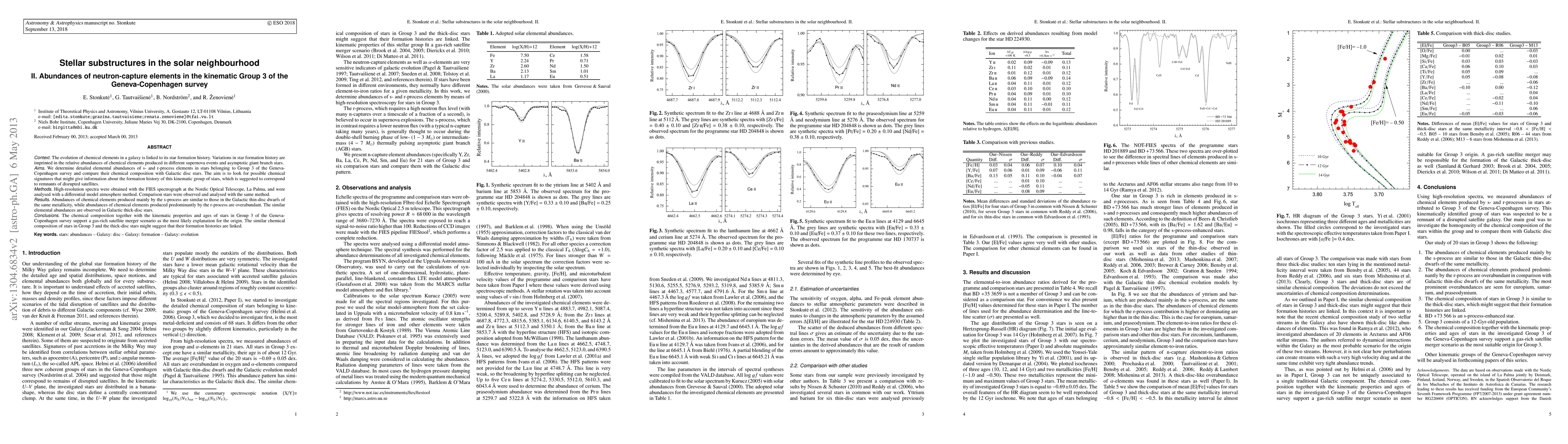 The study of stellar substructures in the solar neighbourhood found that Group 3 stars have similar chemical compositions to Galactic thin-disc dwarfs and thick-disc stars, suggesting a gas-rich satellite merger scenario as their origin.