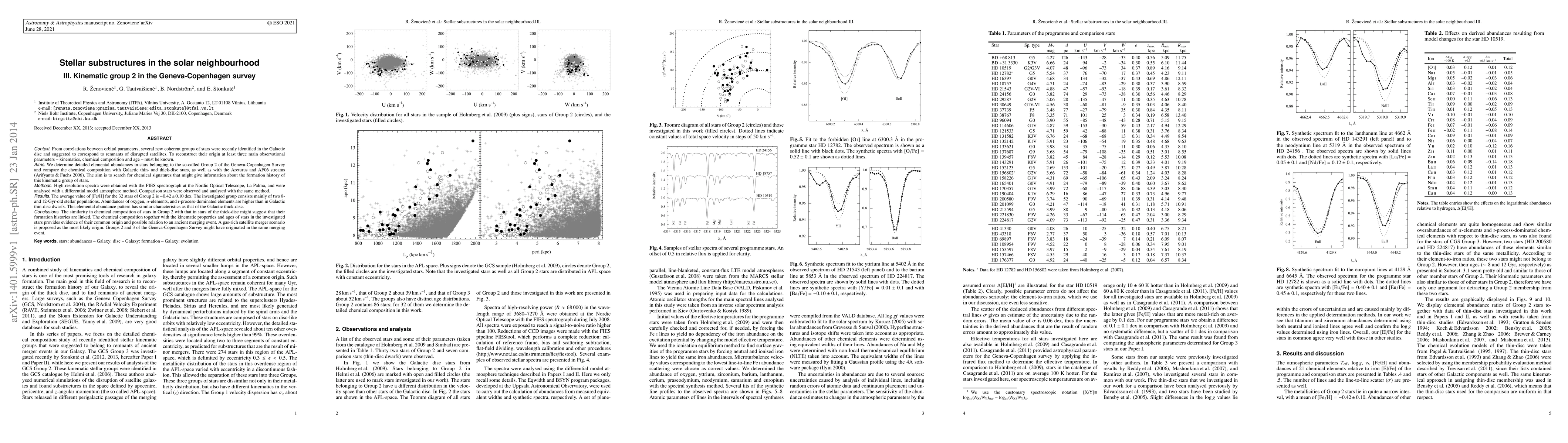 From correlations between orbital parameters, several new coherent groups of stars were recently identified in the Galactic disc and suggested to correspond to remnants of disrupted satellites. To reconstruct their origin at least three main observational parameters - kinematics, chemical composition and age - must be known. We determine detailed elemental abundances in stars belonging to the so-called Group 2 of the Geneva-Copenhagen Survey and compare the chemical composition with Galactic thin- and thick-disc stars, as well as with the Arcturus and AF06 streams. The aim is to search for chemical signatures that might give information about the formation history of this kinematic group of stars. High-resolution spectra were obtained with the FIES spectrograph at the Nordic Optical Telescope, La Palma, and were analysed with a differential model atmosphere method. Comparison stars were observed and analysed with the same method. The average value of [Fe/H] for the 32 stars of Group 2 is -0.42 +- 0.10 dex. The investigated group consists mainly of two 8- and 12-Gyr-old stellar populations. Abundances of oxygen, alpha-elements, and r-process-dominated elements are higher than in Galactic thin-disc dwarfs. This elemental abundance pattern has similar characteristics as that of the Galactic thick-disc. The similarity in chemical composition of stars in Group 2 with that in stars of the thick-disc might suggest that their formation histories are linked. The chemical composition together with the kinematic properties and ages of stars in the investigated stars provides evidence of their common origin and possible relation to an ancient merging event. A gas-rich satellite merger scenario is proposed as the most likely origin. Groups 2 and 3 of the Geneva-Copenhagen Survey might have originated in the same merging event.