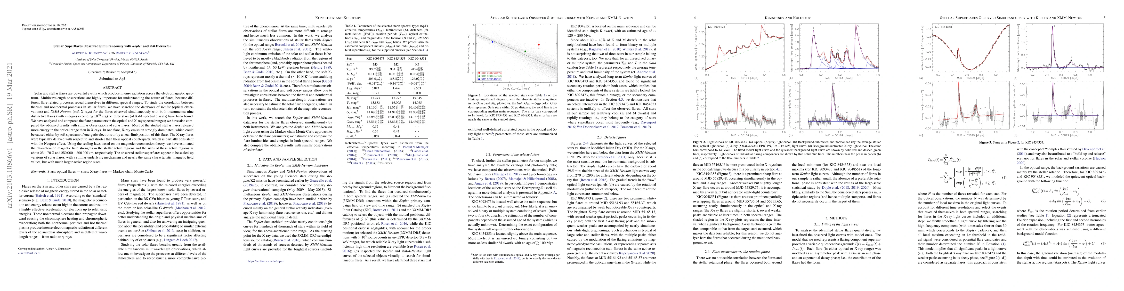 This study investigates nine stellar superflares observed simultaneously by Kepler and XMM-Newton, revealing that most released more energy in optical than X-ray ranges. The findings suggest stellar superflares are scaled-up versions of solar flares with similar magnetic field strengths but larger active regions.