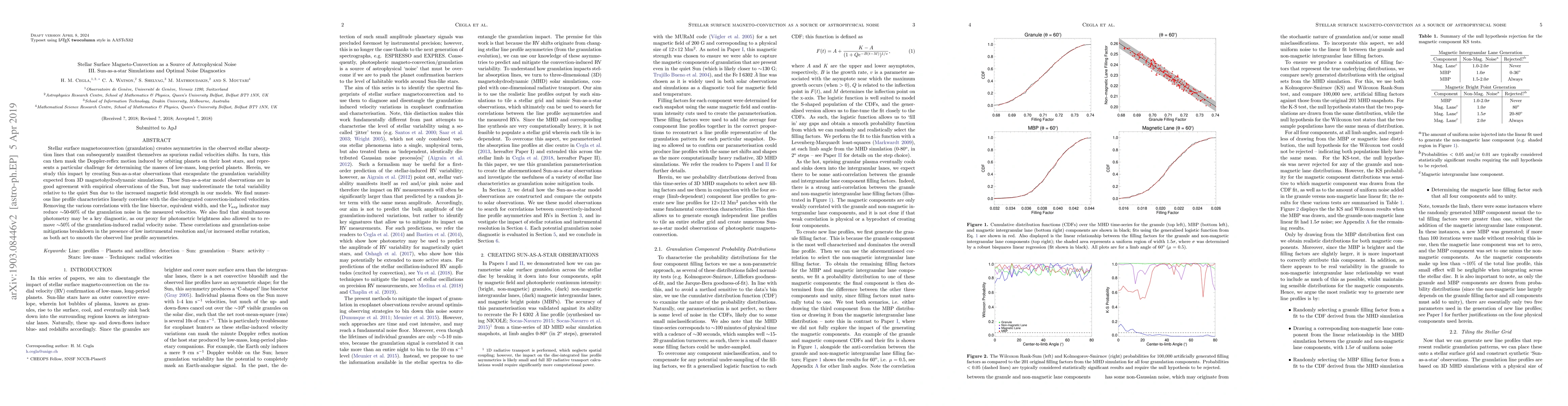 This paper investigates how stellar surface magnetoconvection affects observed radial velocity measurements, potentially masking the reflex motion of orbiting planets. Using Sun-as-a-star models based on 3D magnetohydrodynamic simulations, the authors identify correlations between line profile characteristics and convection-induced velocities, suggesting that removing these correlations could reduce granulation noise by 50-60%. They also find that simultaneous photometry can mitigate granulation noise, though this is less effective at lower instrumental resolutions or higher stellar rotation rates.