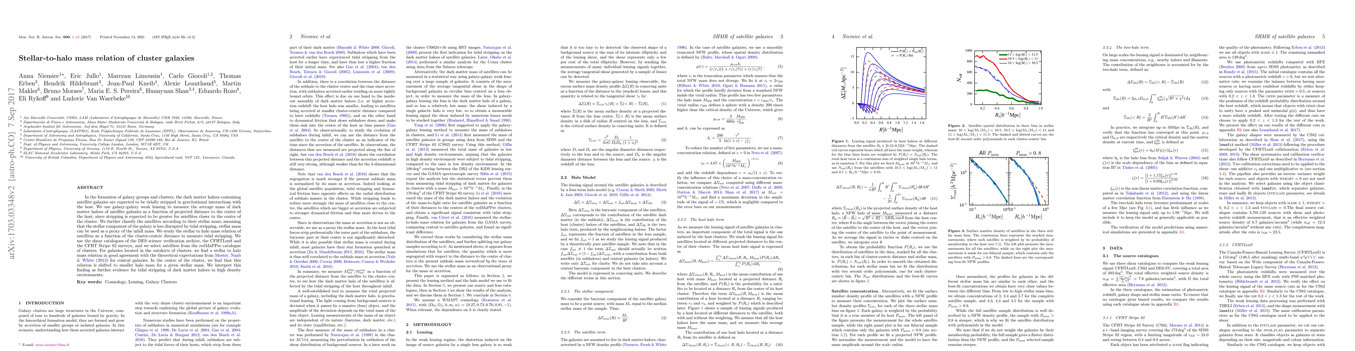 This paper investigates the stellar-to-halo mass relation of satellite galaxies in clusters, using galaxy-galaxy weak lensing to measure dark matter halo masses. The study finds that the relation is shifted to smaller halo masses in the cluster center compared to the outskirts, indicating tidal stripping of dark matter halos by host cluster tidal forces.