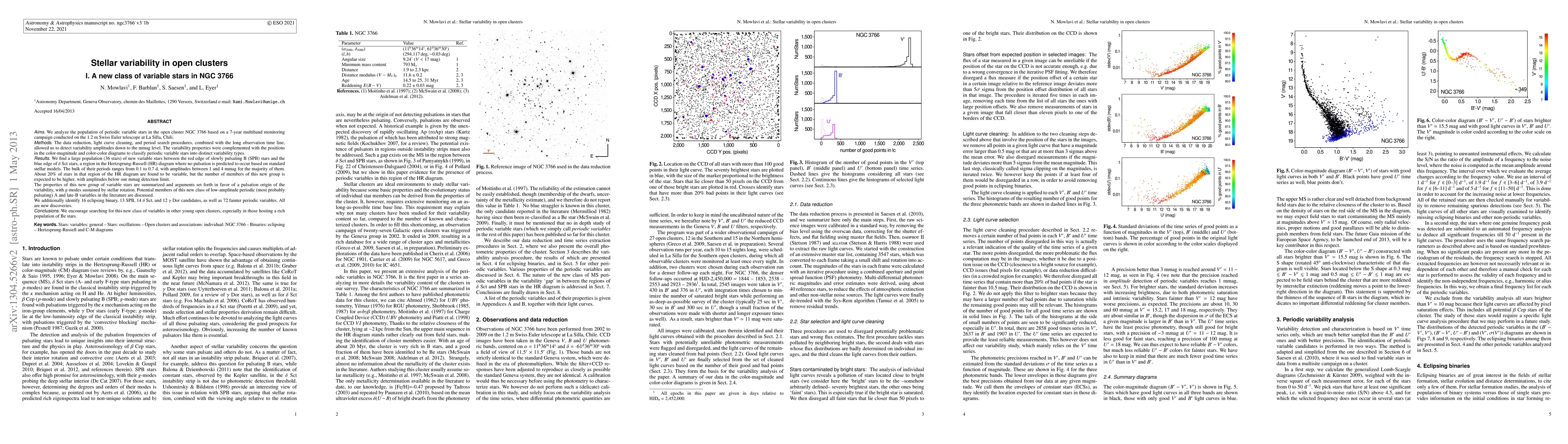 Aims. We analyze the population of periodic variable stars in the open cluster NGC 3766 based on a 7-year multi-band monitoring campaign conducted on the 1.2 m Swiss Euler telescope at La Silla, Chili. Methods. The data reduction, light curve cleaning and period search procedures, combined with the long observation time line, allow us to detect variability amplitudes down to the milli-magnitude level. The variability properties are complemented with the positions in the color-magnitude and color-color diagrams to classify periodic variable stars into distinct variability types. Results. We find a large population (36 stars) of new variable stars between the red edge of slowly pulsating B (SPB) stars and the blue edge of delta Sct stars, a region in the Hertzsprung-Russell (HR) diagram where no pulsation is predicted to occur based on standard stellar models. The bulk of their periods ranges from 0.1 to 0.7 d, with amplitudes between 1 and 4 mmag for the majority of them. About 20% of stars in that region of the HR diagram are found to be variable, but the number of members of this new group is expected to be higher, with amplitudes below our milli-magnitude detection limit. The properties of this new group of variable stars are summarized, and arguments set forth in favor of a pulsation origin of the variability, with g-modes sustained by stellar rotation. Potential members of this new class of low-amplitude periodic (most probably pulsating) A and late-B variables in the literature are discussed. We additionally identify 16 eclipsing binary, 13 SPB, 14 delta Sct and 12 gamma Dor candidates, as well as 72 fainter periodic variables. All are new discoveries. Conclusions. We encourage to search for the existence of this new class of variables in other young open clusters, especially in those hosting a rich population of Be stars.