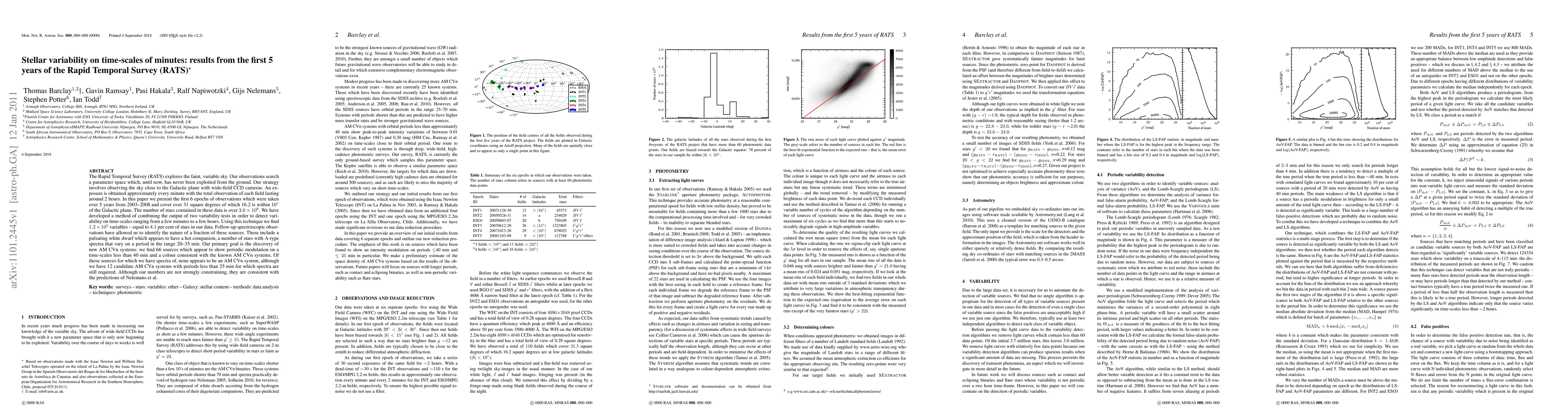 The Rapid Temporal Survey (RATS) explores the faint, variable sky. Our observations search a parameter space which, until now, has never been exploited from the ground. Our strategy involves observing the sky close to the Galactic plane with wide-field CCD cameras. An exposure is obtained approximately every minute with the total observation of each field lasting around 2 hours. In this paper we present the first 6 epochs of observations which were taken over 5 years from 2003--2008 and cover over 31 square degrees of which 16.2 is within 10{\deg} of the Galactic plane. The number of stars contained in these data is over 3.0 x10^6. We have developed a method of combining the output of two variability tests in order to detect variability on time-scales ranging from a few minutes to a few hours. Using this technique we find 1.2 x 10^5 variables -- equal to 4.1 per cent of stars in our data. Follow-up spectroscopic observations have allowed us to identify the nature of a fraction of these sources. These include a pulsating white dwarf which appears to have a hot companion, a number of stars with A-type spectra that vary on a period in the range 20--35 min. Our primary goal is the discovery of new AM CVn systems: we find 66 sources which appear to show periodic modulation on a time-scales less than 40 min and a colour consistent with the known AM CVn systems. Of those sources for which we have spectra of, none appears to be an AM CVn system, although we have 12 candidate AM CVn systems with periods less than 25 min for which spectra are still required. Although our numbers are not strongly constraining, they are consistent with the predictions of Nelemans et al.