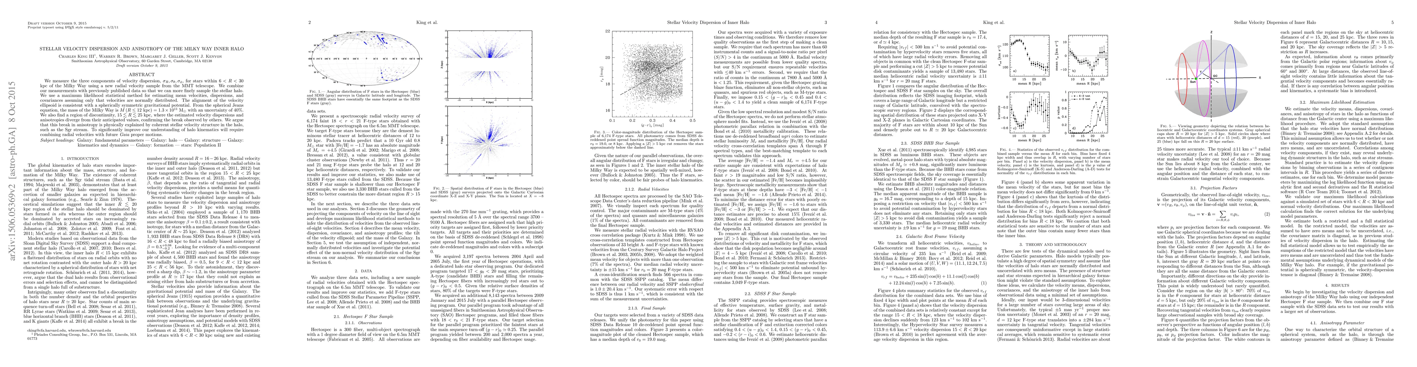 We measure the three components of velocity dispersion, $\sigma_{R},\sigma_{\theta},\sigma_{\phi}$, for stars within 6 < R < 30 kpc of the Milky Way using a new radial velocity sample from the MMT telescope. We combine our measurements with previously published data so that we can more finely sample the stellar halo. We use a maximum likelihood statistical method for estimating mean velocities, dispersions, and covariances assuming only that velocities are normally distributed. The alignment of the velocity ellipsoid is consistent with a spherically symmetric gravitational potential. From the spherical Jeans equation, the mass of the Milky Way is M(<12 kpc) = $1.3\times10^{11}$ M$_{\odot}$ with an uncertainty of 40%. We also find a region of discontinuity, 15 < R < 25 kpc, where the estimated velocity dispersions and anisotropies diverge from their anticipated values, confirming at high significance the break observed by others. We argue that this break in anisotropy is physically explained by coherent stellar velocity structure in the halo, such as the Sgr stream. To significantly improve our understanding of halo kinematics will require combining radial velocities with future Gaia proper motions.