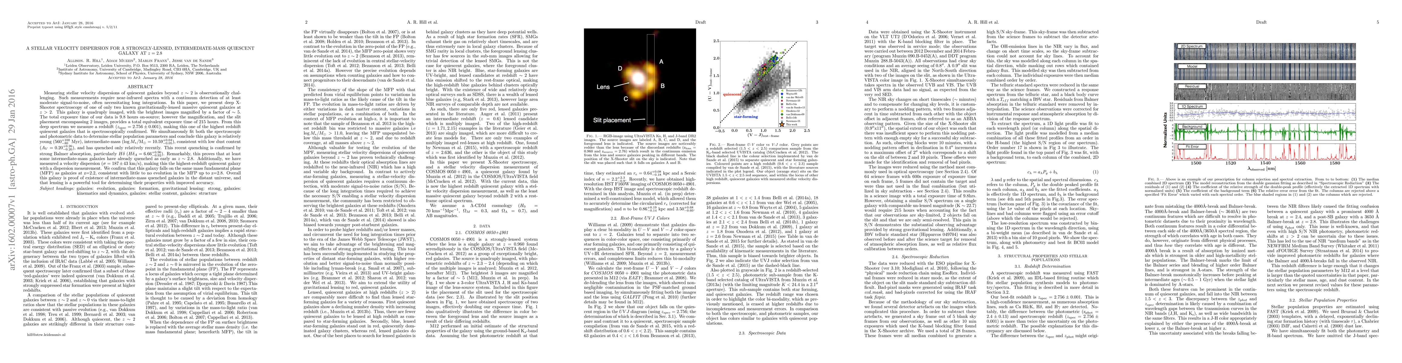 Measuring stellar velocity dispersions of quiescent galaxies beyond $z\sim2$ is observationally challenging. Such measurements require near-infrared spectra with a continuum detection of at least moderate signal-to-noise, often necessitating long integrations. In this paper, we present deep X-Shooter spectroscopy of one of only two known gravitationally-lensed massive quiescent galaxies at $z>2$. This galaxy is quadruply imaged, with the brightest images magnified by a factor of $\sim5$. The total exposure time of our data is 9.8 hours on-source; however the magnification, and the slit placement encompassing 2 images, provides a total equivalent exposure time of 215 hours. From this deep spectrum we measure a redshift ($z_{\mathrm{spec}}=2.756\pm0.001$), making this one of the highest redshift quiescent galaxies that is spectroscopically confirmed. We simultaneously fit both the spectroscopic and photometric data to determine stellar population parameters and conclude this galaxy is relatively young, intermediate-mass, consistent with low dust content, and has quenched only relatively recently. This recent quenching is confirmed by strong Balmer absorption, particularly $H\delta$. Remarkably, this proves that at least some intermediate-mass galaxies have already quenched as early as $z\sim2.8$. Additionally, we have measured a velocity dispersion ($\sigma=187\pm43~\mathrm{km/s}$), making this the highest-redshift quiescent galaxy with a dispersion measurement. We confirm that this galaxy falls on the same mass fundamental plane (MFP) as galaxies at z=2.2, consistent with little to no evolution in the MFP up to z=2.8. Overall this galaxy is proof of existence of intermediate-mass quenched galaxies in the distant universe, and that lensing is a powerful tool for determining their properties with improved accuracy.