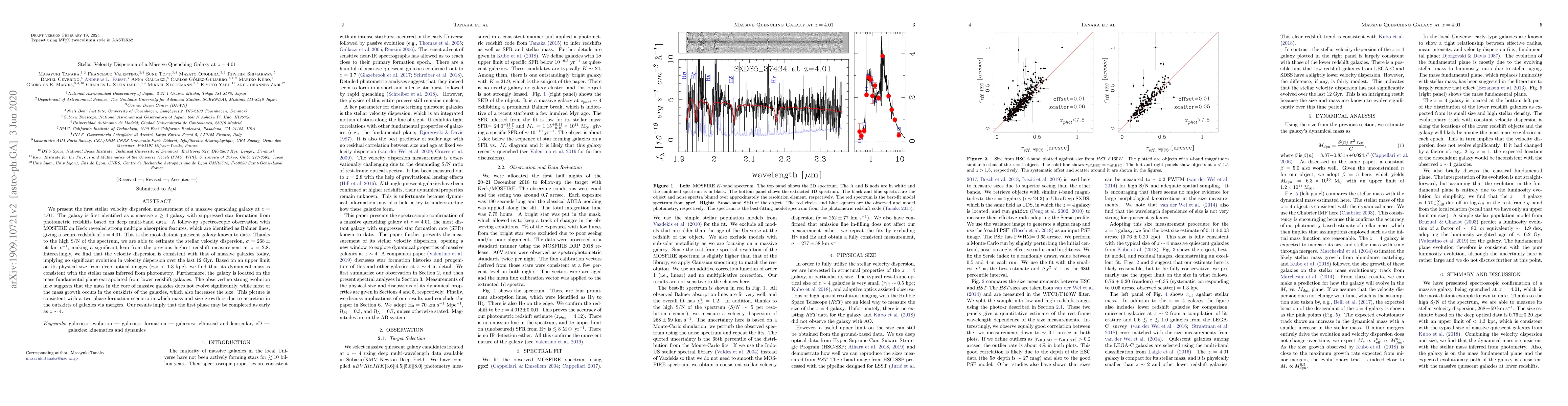 This paper reports the first stellar velocity dispersion measurement of a massive quenching galaxy at z=4.01, finding it to be consistent with that of present-day massive galaxies, suggesting no significant evolution over the last 12 billion years. The galaxy's size and mass growth, however, indicate that most mass accumulation occurs in the outskirts through mergers.