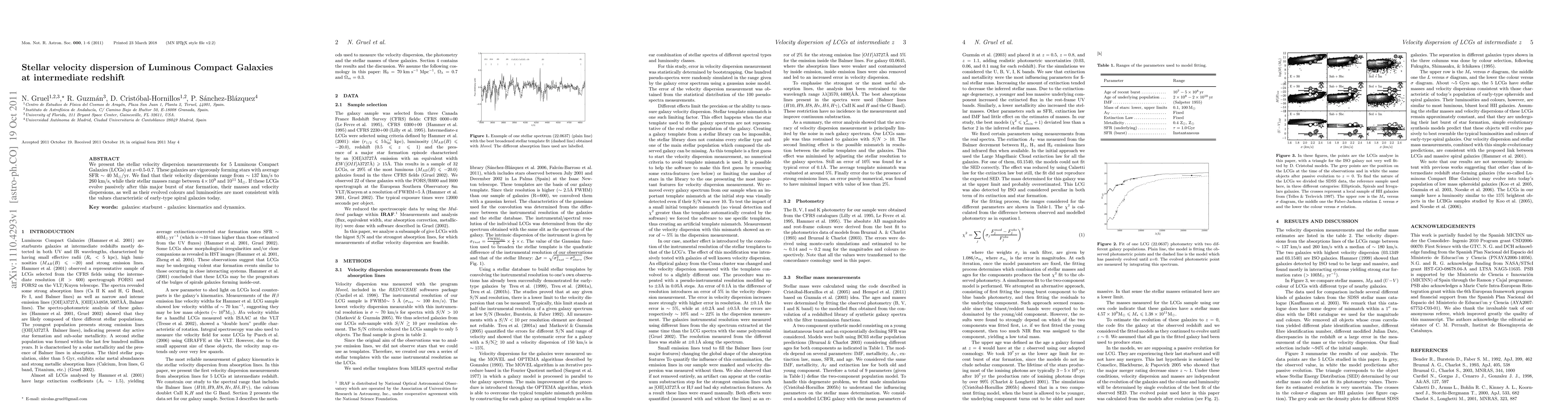 We present the stellar velocity dispersion measurements for 5 Luminous Compact Galaxies (LCGs) at z=0.5-0.7. These galaxies are vigorously forming stars with average SFR $\sim$ 40 M$_{\odot}$/yr. We find that their velocity dispersions range from $\sim137\ \rm{km/s}$ to $260\ \rm{km/s}$, while their stellar masses range between $4\times 10^{9}$ and $10^{11}$ M$_{\odot}$. If these LCGs evolve passively after this major burst of star formation, their masses and velocity dispersions, as well as their evolved colours and luminosities are most consistent with the values characteristic of early-type spiral galaxies today.