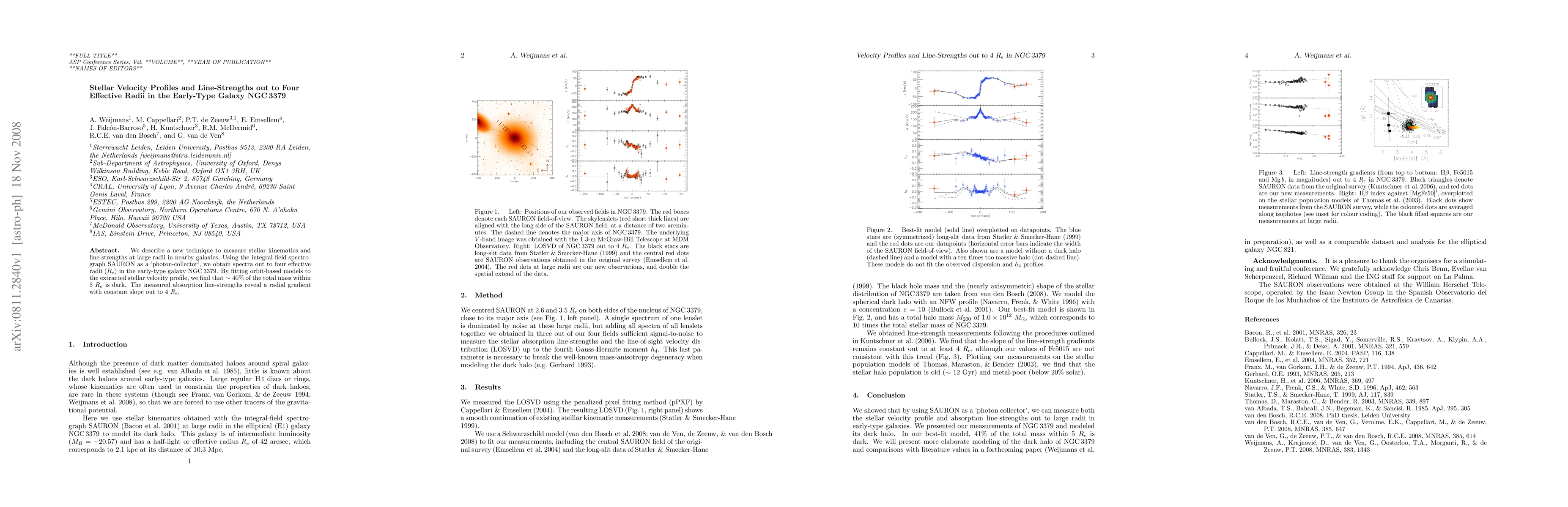 We describe a new technique to measure stellar kinematics and line-strengths at large radii in nearby galaxies. Using the integral-field spectrograph SAURON as a 'photon-collector', we obtain spectra out to four effective radii (Re) in the early-type galaxy NGC 3379. By fitting orbit-based models to the extracted stellar velocity profile, we find that ~40% of the total mass within 5 Re is dark. The measured absorption line-strengths reveal a radial gradient with constant slope out to 4 Re.