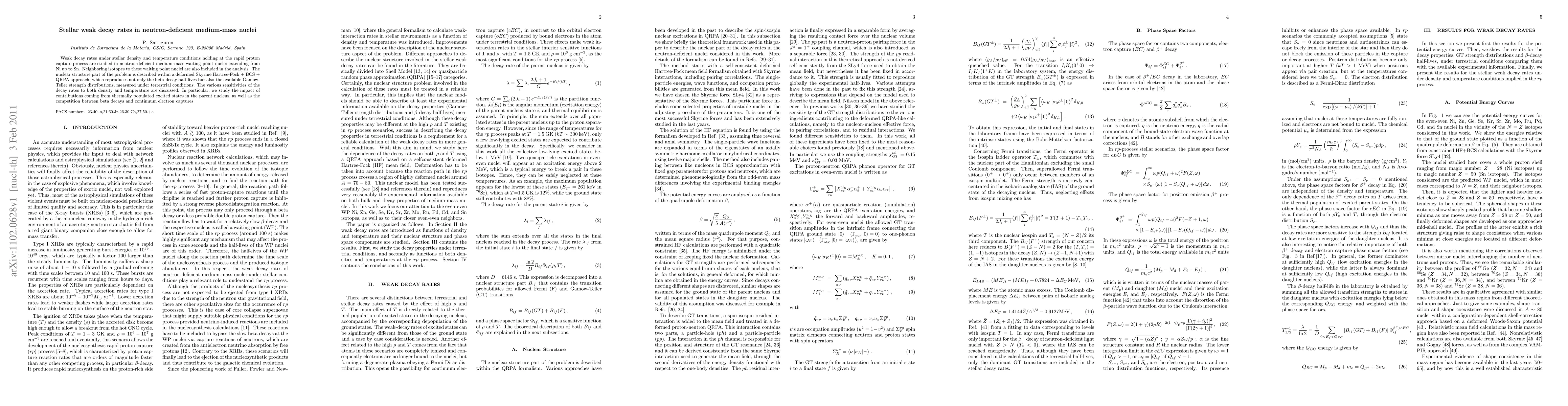 This paper investigates weak decay rates in neutron-deficient medium-mass nuclei under stellar conditions, employing a deformed Skyrme Hartree-Fock + BCS + QRPA approach. The study highlights the impact of temperature and density on decay rates, including the influence of thermally excited states and the competition between beta decays and electron captures.