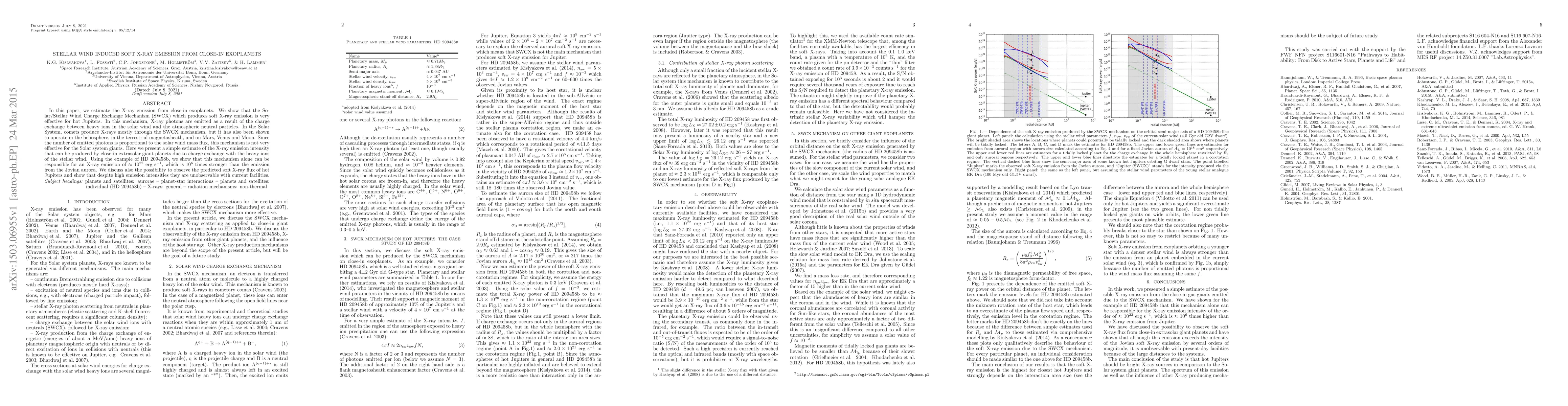 This paper estimates the soft X-ray emission from close-in exoplanets due to the Solar/Stellar Wind Charge Exchange Mechanism, demonstrating its effectiveness for hot Jupiters like HD~209458b, which can emit $\approx 10^{22}$~erg~s$^{-1}$. Despite the high emission intensity, current facilities cannot observe this predicted soft X-ray flux.
