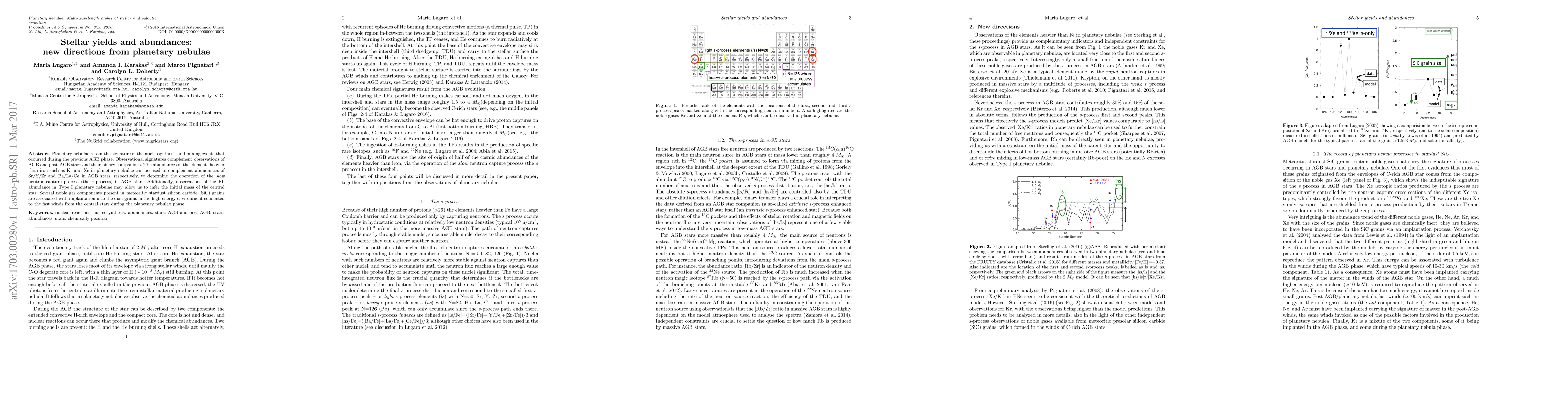 Planetary nebulae retain the signature of the nucleosynthesis and mixing events that occurred during the previous AGB phase. Observational signatures complement observations of AGB and post-AGB stars and their binary companions. The abundances of the elements heavier than iron such as Kr and Xe in planetary nebulae can be used to complement abundances of Sr/Y/Zr and Ba/La/Ce in AGB stars, respectively, to determine the operation of the slow neutron-capture process (the s process) in AGB stars. Additionally, observations of the Rb abundance in Type I planetary nebulae may allow us to infer the initial mass of the central star. Several noble gas components present in meteoritic stardust silicon carbide (SiC) grains are associated with implantation into the dust grains in the high-energy environment connected to the fast winds from the central stars during the planetary nebulae phase.