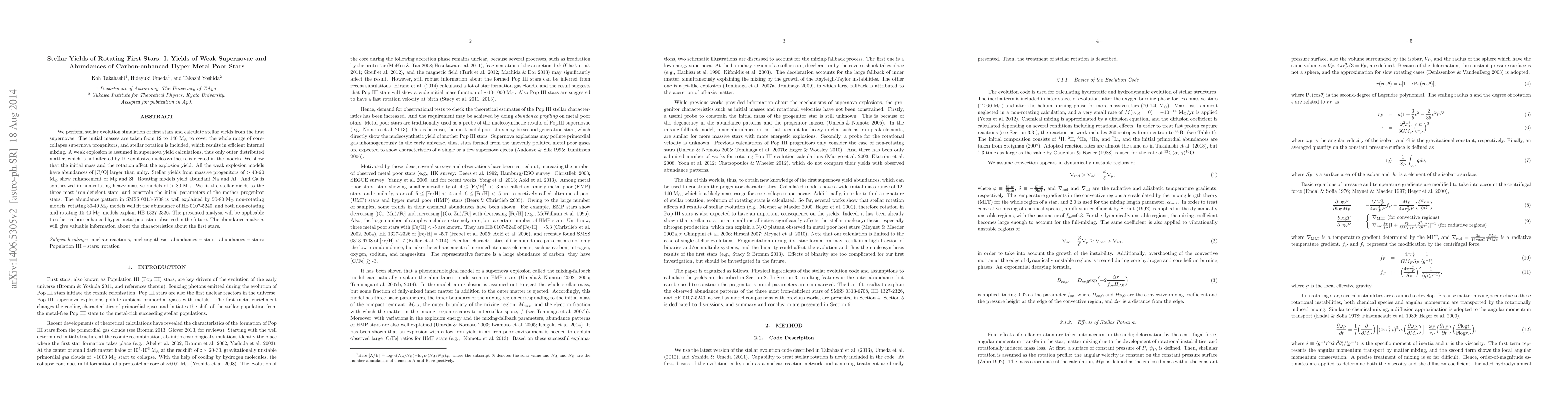 This paper investigates the stellar yields from rotating first stars through simulations, focusing on weak supernovae and their impact on carbon-enhanced hyper metal poor stars. It reveals that rotation and initial mass significantly influence the explosion yield and element abundances, providing insights into the progenitors of the most iron-deficient stars.