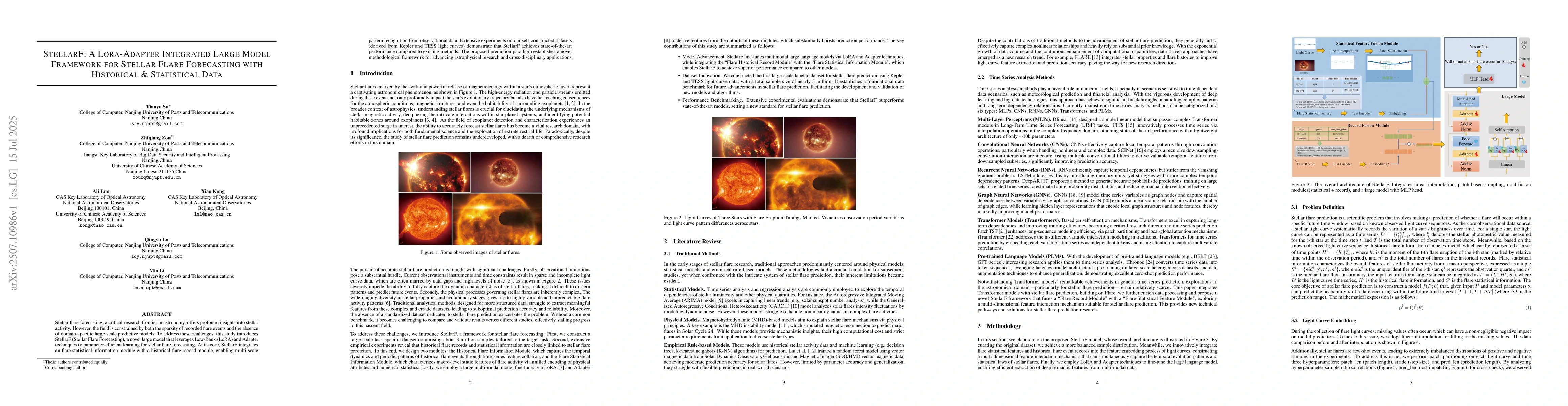 Stellar flare forecasting, a critical research frontier in astronomy, offers profound insights into stellar activity. However, the field is constrained by both the sparsity of recorded flare events and the absence of domain-specific large-scale predictive models. To address these challenges, this study introduces StellarF (Stellar Flare Forecasting), a novel large model that leverages Low-Rank (LoRA) and Adapter techniques to parameter-efficient learning for stellar flare forecasting. At its core, StellarF integrates an flare statistical information module with a historical flare record module, enabling multi-scale pattern recognition from observational data. Extensive experiments on our self-constructed datasets (derived from Kepler and TESS light curves) demonstrate that StellarF achieves state-of-the-art performance compared to existing methods. The proposed prediction paradigm establishes a novel methodological framework for advancing astrophysical research and cross-disciplinary applications.