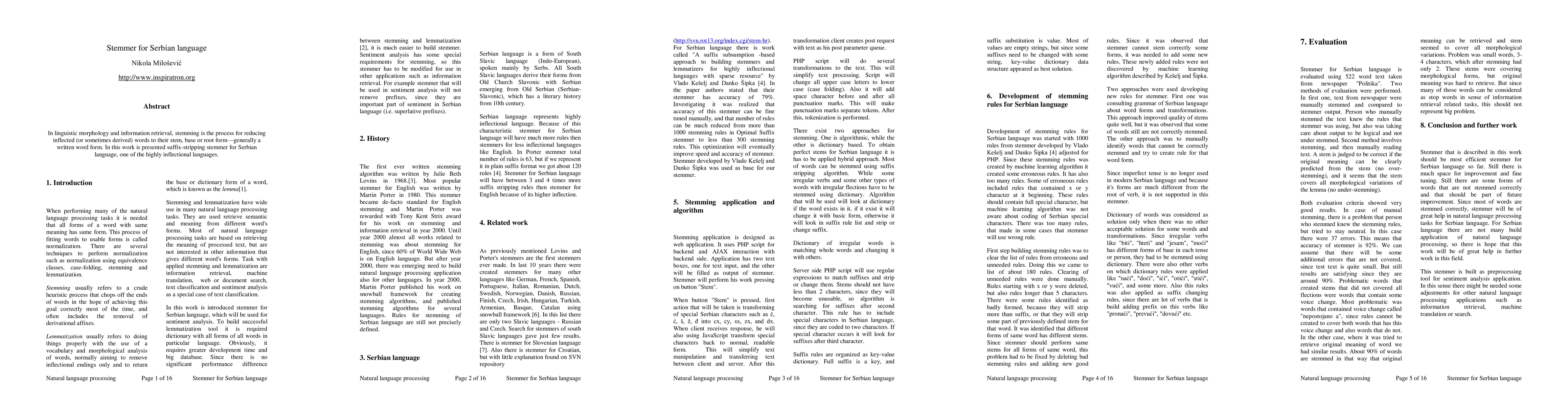 In linguistic morphology and information retrieval, stemming is the process for reducing inflected (or sometimes derived) words to their stem, base or root form; generally a written word form. In this work is presented suffix stripping stemmer for Serbian language, one of the highly inflectional languages.